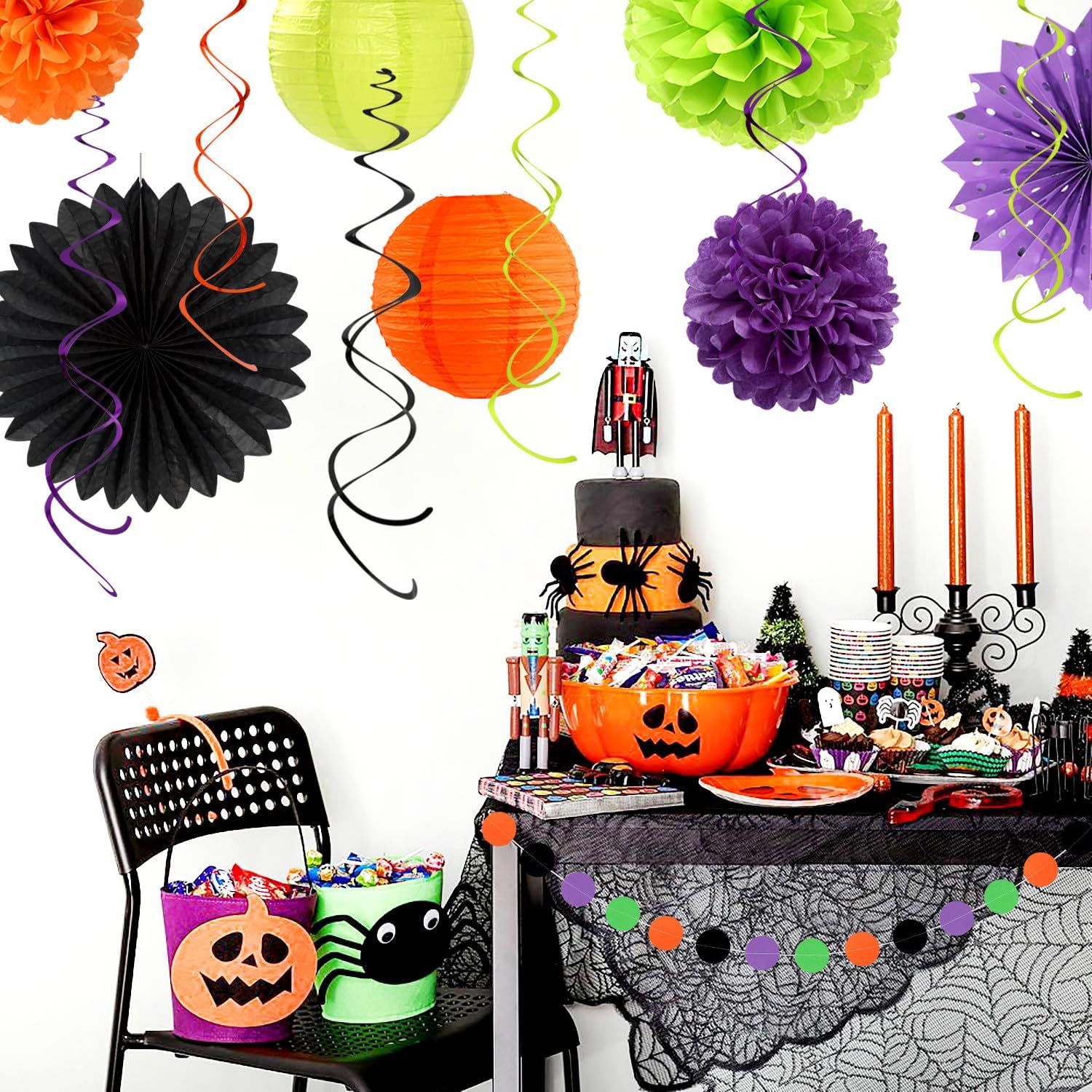 Black-Green Orange-Purple Halloween Birthday Party-Decorations - 21pcs Happy Banner,Paper Lanterns Honeycomb,Tissue Pom Poms Flower Fan,Kids Classroom Hanging Streamers Garland Decor Supplies Huglony