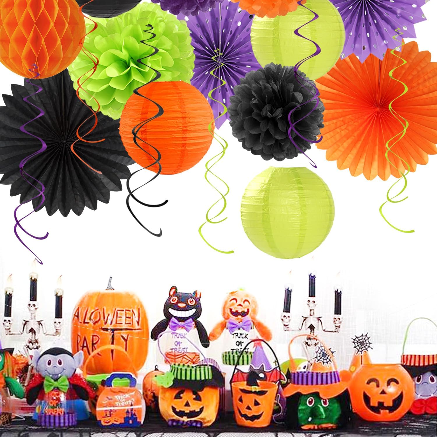 • 【Black Green Orange Purple Party Kits】This kits include 1pcs happy halloween banner, 1pcs circle dots paper banner, 4pcs tissue pom poms: 3pcs 10" and 1pcs 12" , 3pcs 8inch paper honeycom ball, 2pcs 8inch paper lantern, 4pcs 12inch paper flower fan, 6pcs Paper swirls hanging streamers.