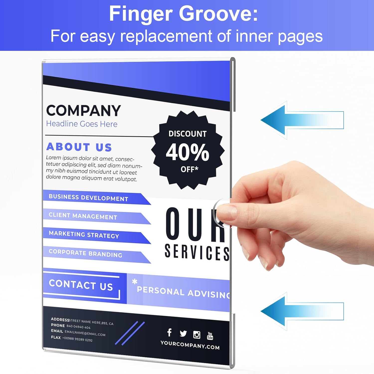 • ✔ 【𝐇𝐢𝐠𝐡-𝐐𝐮𝐚𝐥𝐢𝐭𝐲 𝐌𝐚𝐭𝐞𝐫𝐢𝐚𝐥】Our 8 1/2 x 11 acrylic sign holders are meticulously crafted from high-quality acrylic material, ensuring exceptional transparency to present your sign holder with a clear image。Please remove the protective film on the acrylic panel and base which designed to prevent scratches on the product before using.