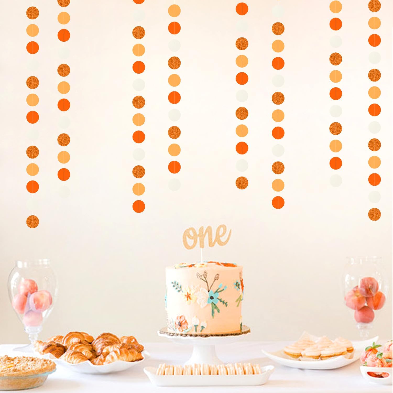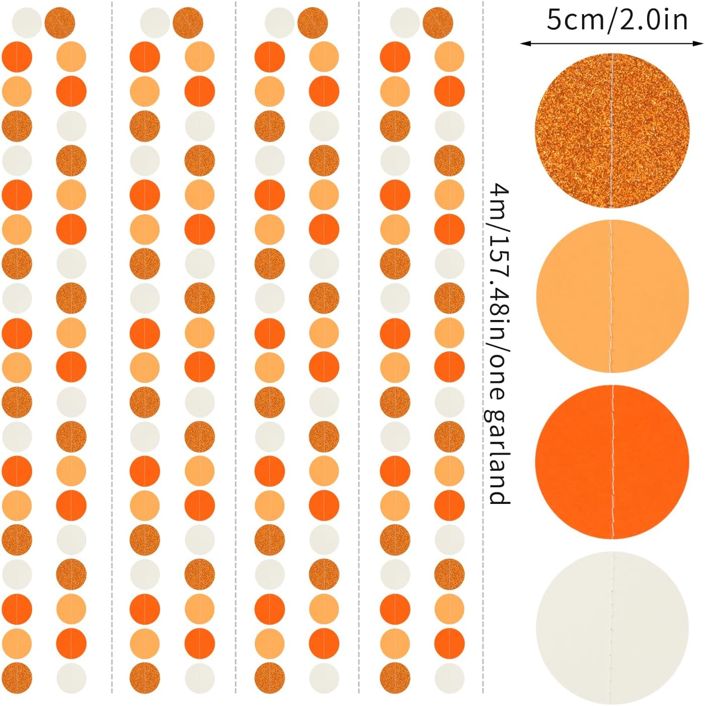 • PACKAGE CONTAINS: This set has four Orange-Beige circle paper garland,the length of each strand is 4 meters/13 feet, the total length is 16 meters/52 feet.The size is 2IN.