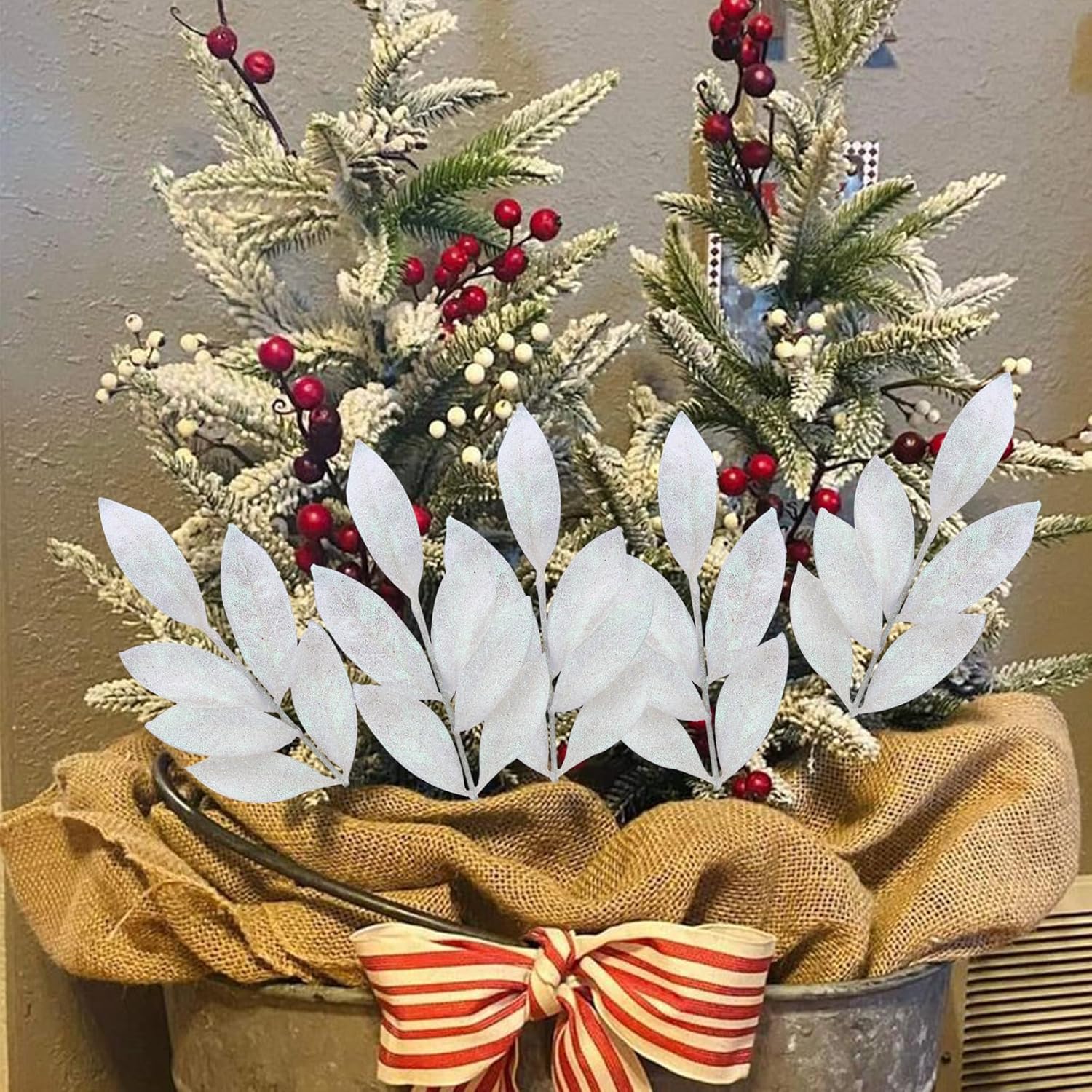GREENTIME 12 Pack Artificial White Glitter Leaves 13" Fake Christmas Picks Decorative Glitter Sticks for Vase Christmas Tree DIY Wreath Crafts Fireplace Decor