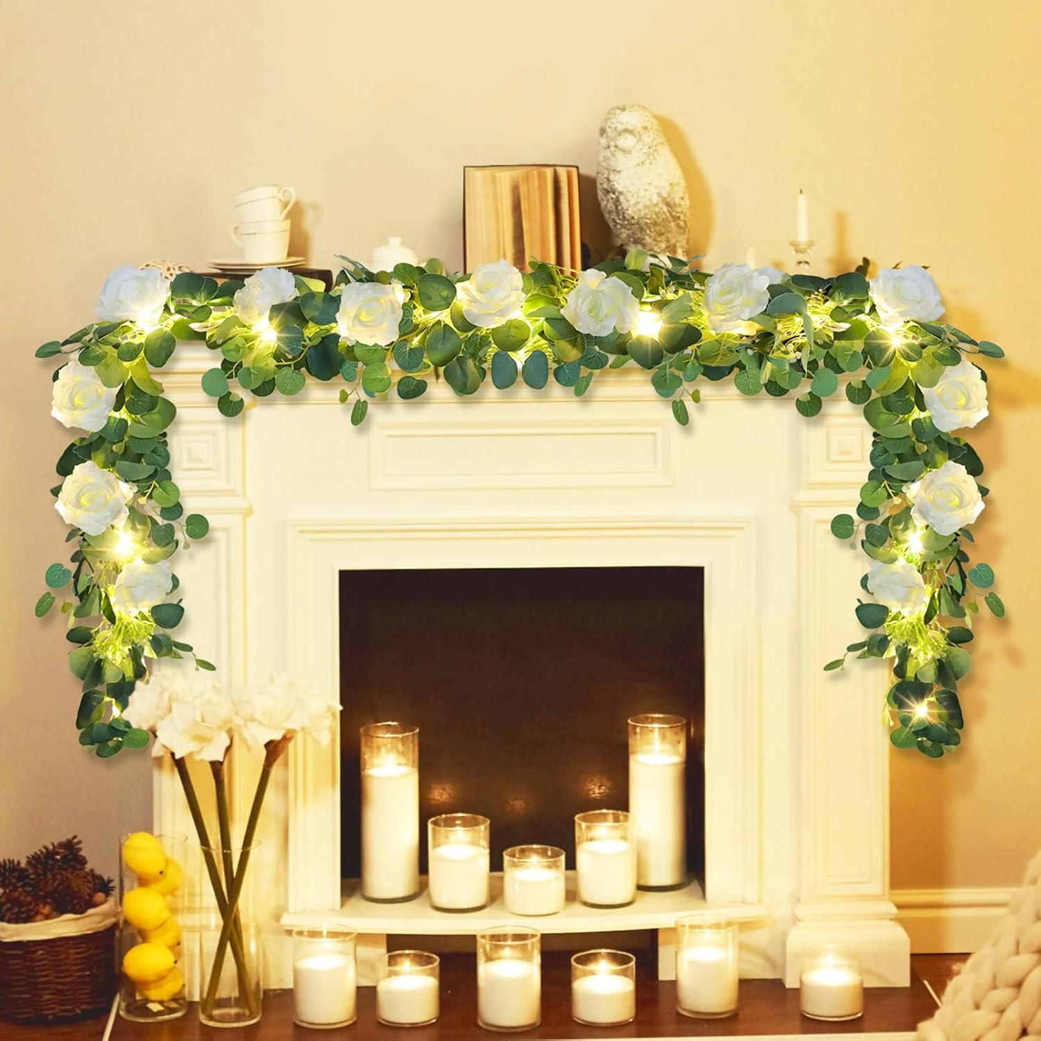 • Eucalyptus Garland with Built-in LED Lights: Transform any space into a magical setting with our 6.6FT eucalyptus garland, now upgraded with built-in led lights! Whether decorating a wedding arch, table centerpiece, fireplace mantel, backdrop, or outdoor garden fence, this rose flower garland brings timeless elegance and a touch of romance to any occasion. The versatile design allows for endless creative possibilities, making it perfect for weddings, Valentines Day, Mothers Day or seasonal celebrations