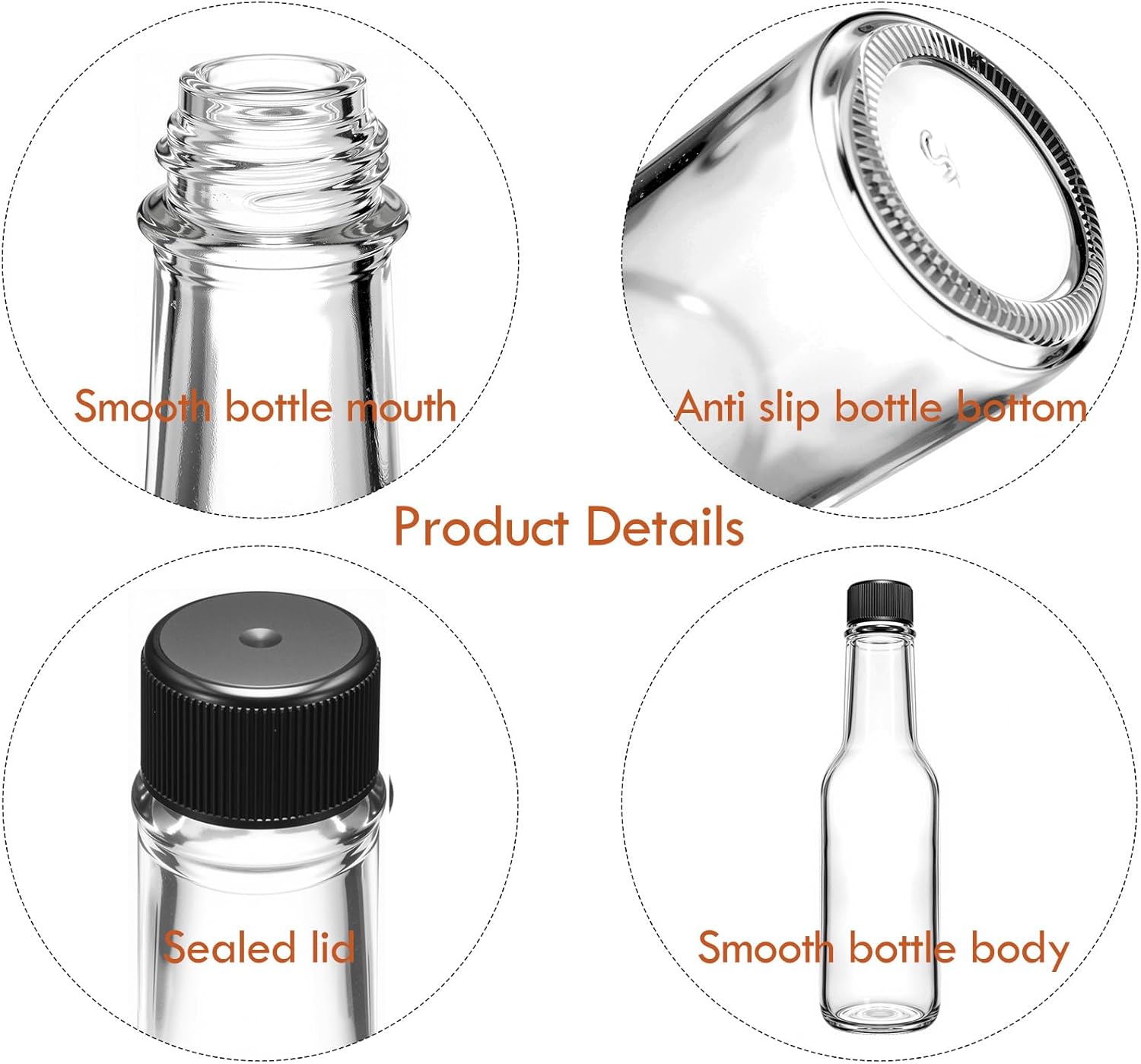 • Premium Quality: Our 24 pack 5oz mini hot sauce bottles are made of high-quality glass, ensuring durability and preserving the freshness of the hot sauce. The black lids and shrink capsules provide an airtight seal to keep the hot sauce/oil fresh