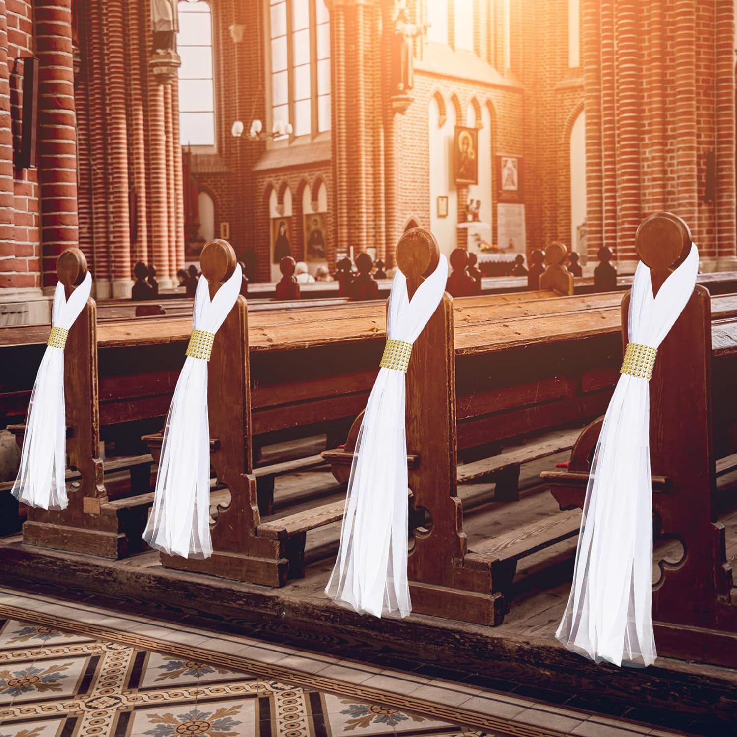 • Wedding White Pew Bows Tulle Set: 26 pieces church pew wedding bows tulle decorations; Each set wedding decorations for ceremony is assembled,tulle is decorated with a gold shiny rhinestone wrap;adequate quantity and exquisite style to meet your wedding decor chair decoration needs