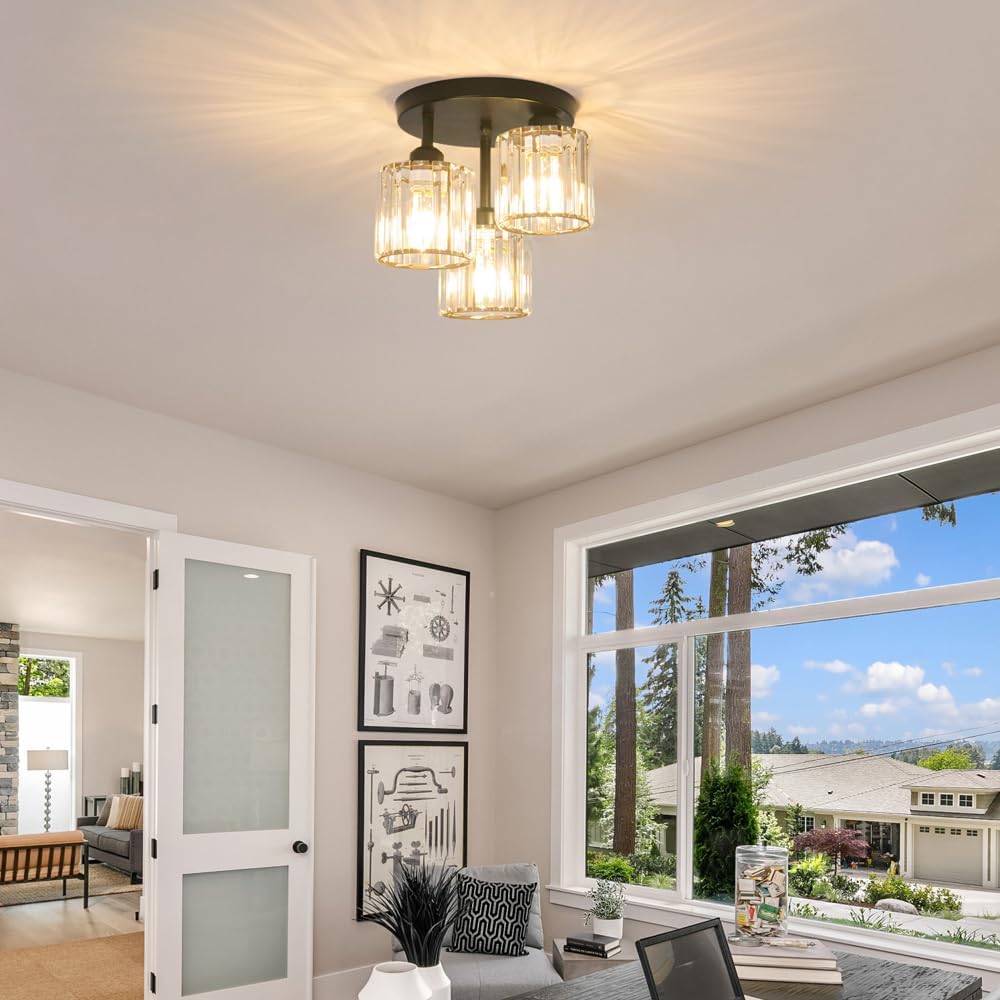 • 【Semi Flush Mount Ceiling Light】: The crystal ceiling light is unique open design ensures that light is distributed evenly. Black metal frame with clear crystal shades create a wonderful glow to illuminate your space with some appealing style