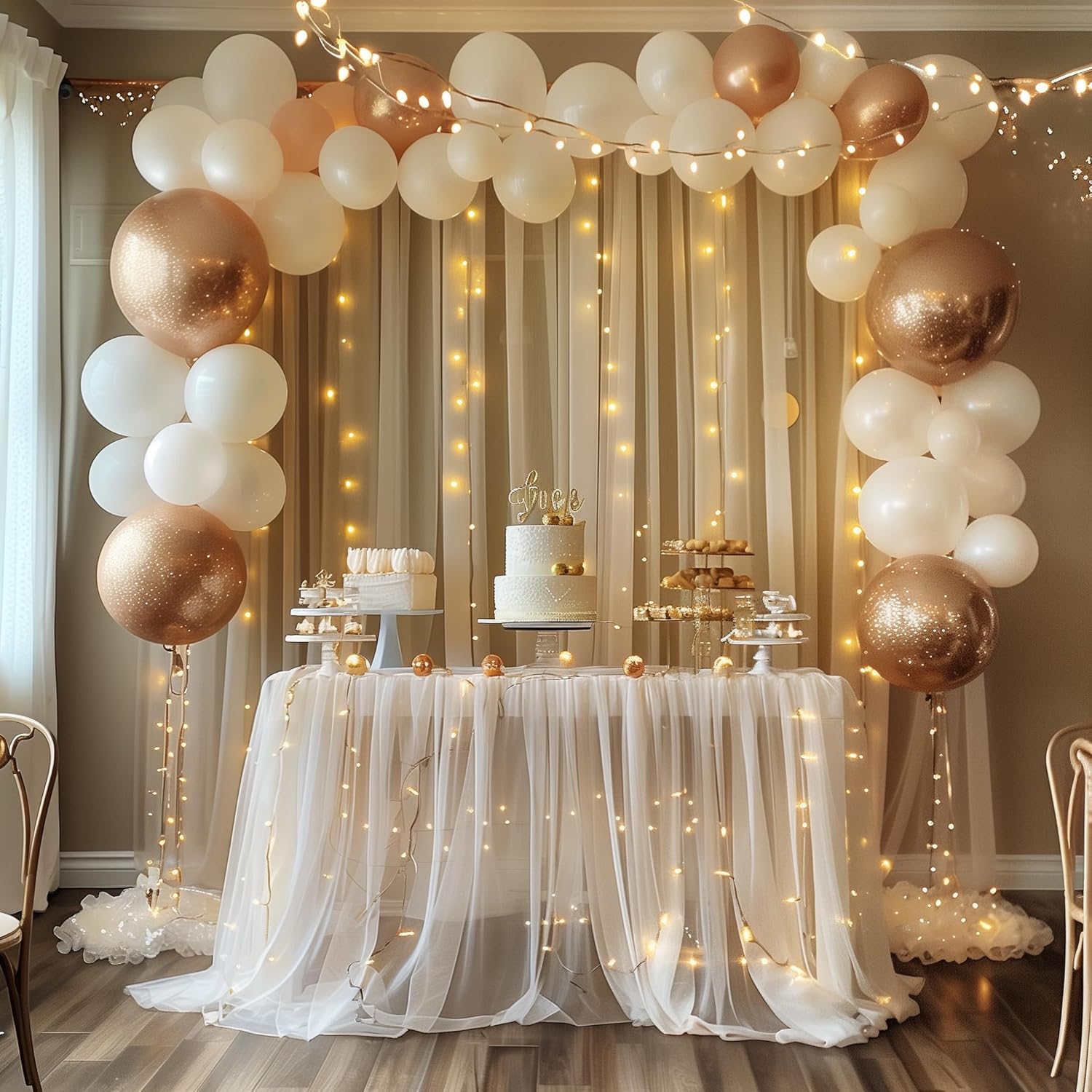 • Package Includes: 2 panels champagne tulle backdrop curtains, each sheer curtain backdrop is 5FT width and 8FT height. Also it includes a set of 10FT (10 strands) warm string light (USB powered,no remote control) and 12pcs transparent clips.