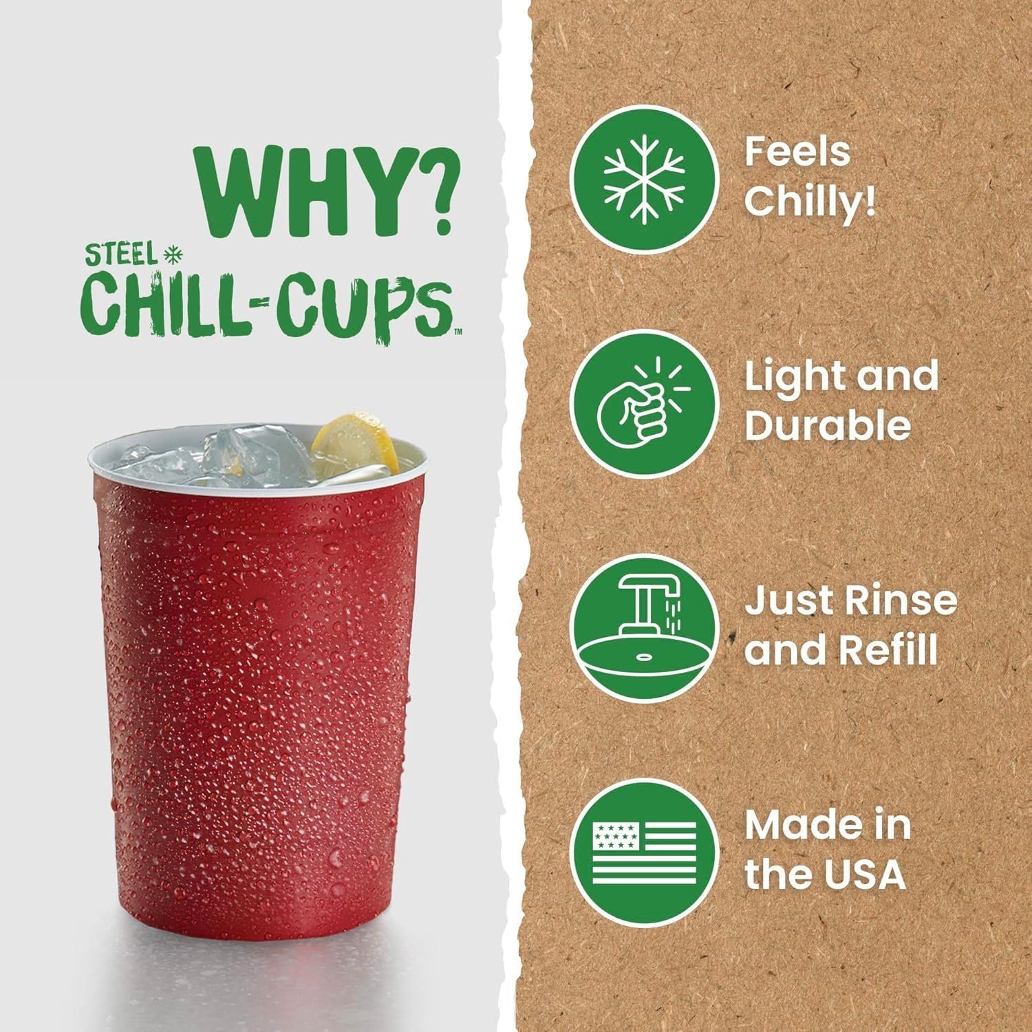 • Earth-Friendly Drinkware: Unlike plastic party cups that end up in landfills, sustainable Steel Chill Cups are 100% recyclable; reuse hand-washable cups for your corporate event