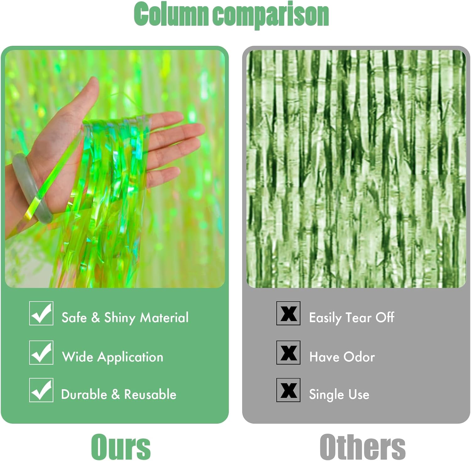 • PACKAGE INCLUDED : 2 pack of clear green foil fringe curtains, the size of each tinsel curtain is 3.2 ft x 6.5 ft, enough length for hanging on a door or covering a wall fully, suitable for any parties.