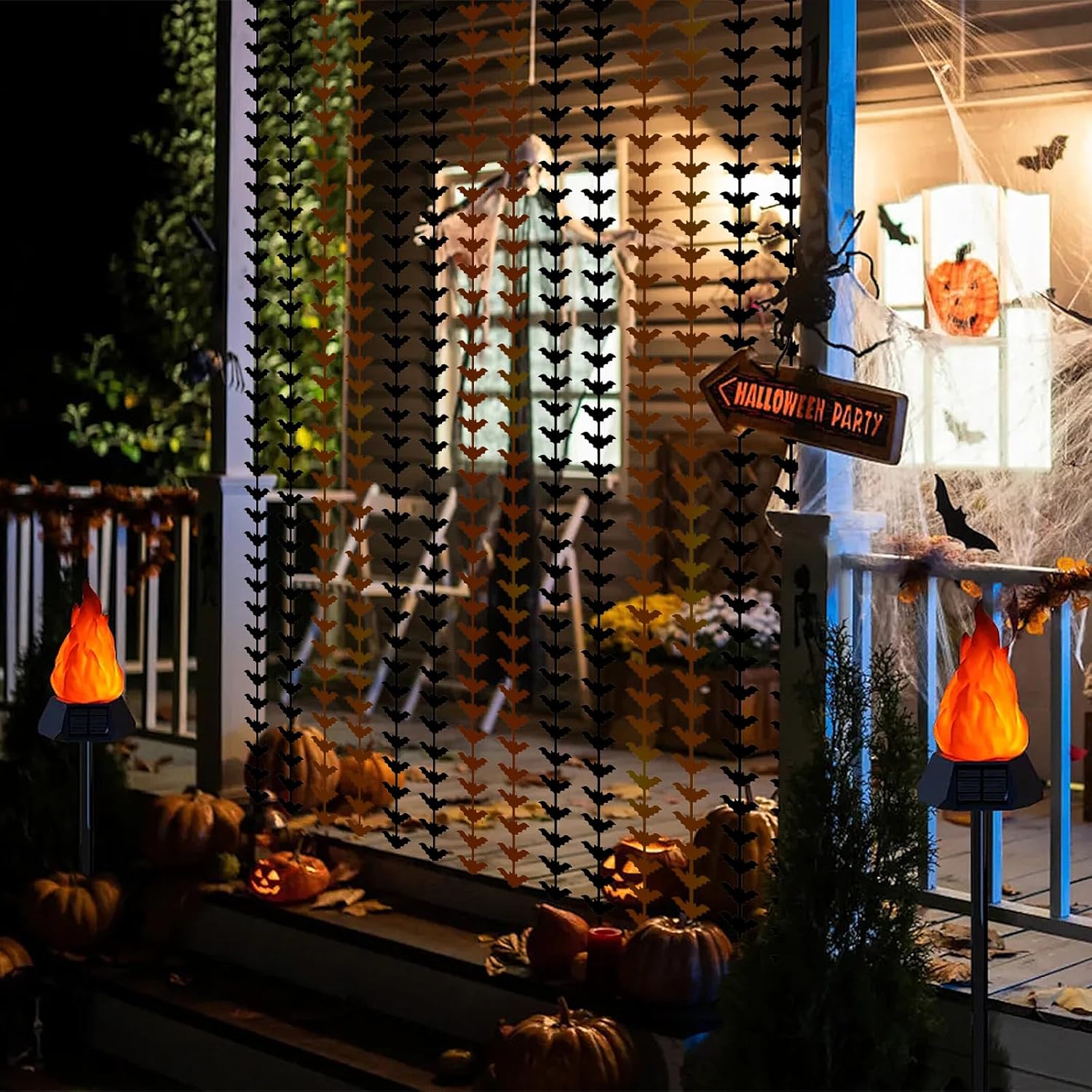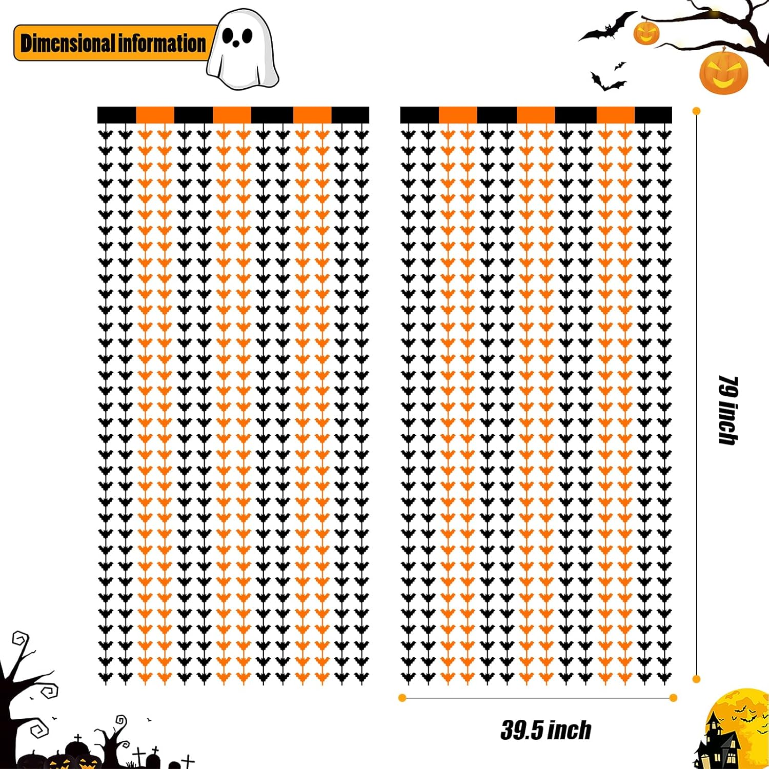 • PACKAGE INCLUDED : 2 pack of black and orange bat foil fringe curtains, the size of each tinsel curtain is 3.2 ft x 6.5 ft, enough length for hanging on a door or covering a wall fully, suitable for any parties.