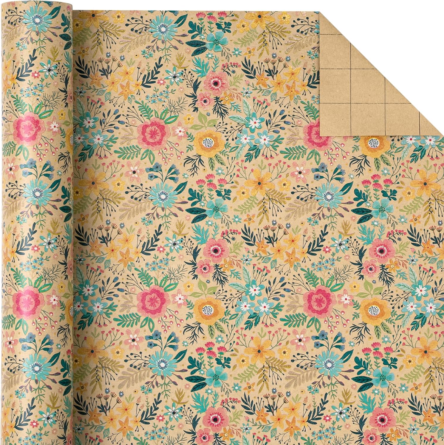 WRAPAHOLIC Kraft Floral Wrapping Paper Roll - Mini Roll - 17 Inch x 9.8 Feet - Spring Summer Garden Flower Design Perfect for Wedding, Bridal Shower, Birthday