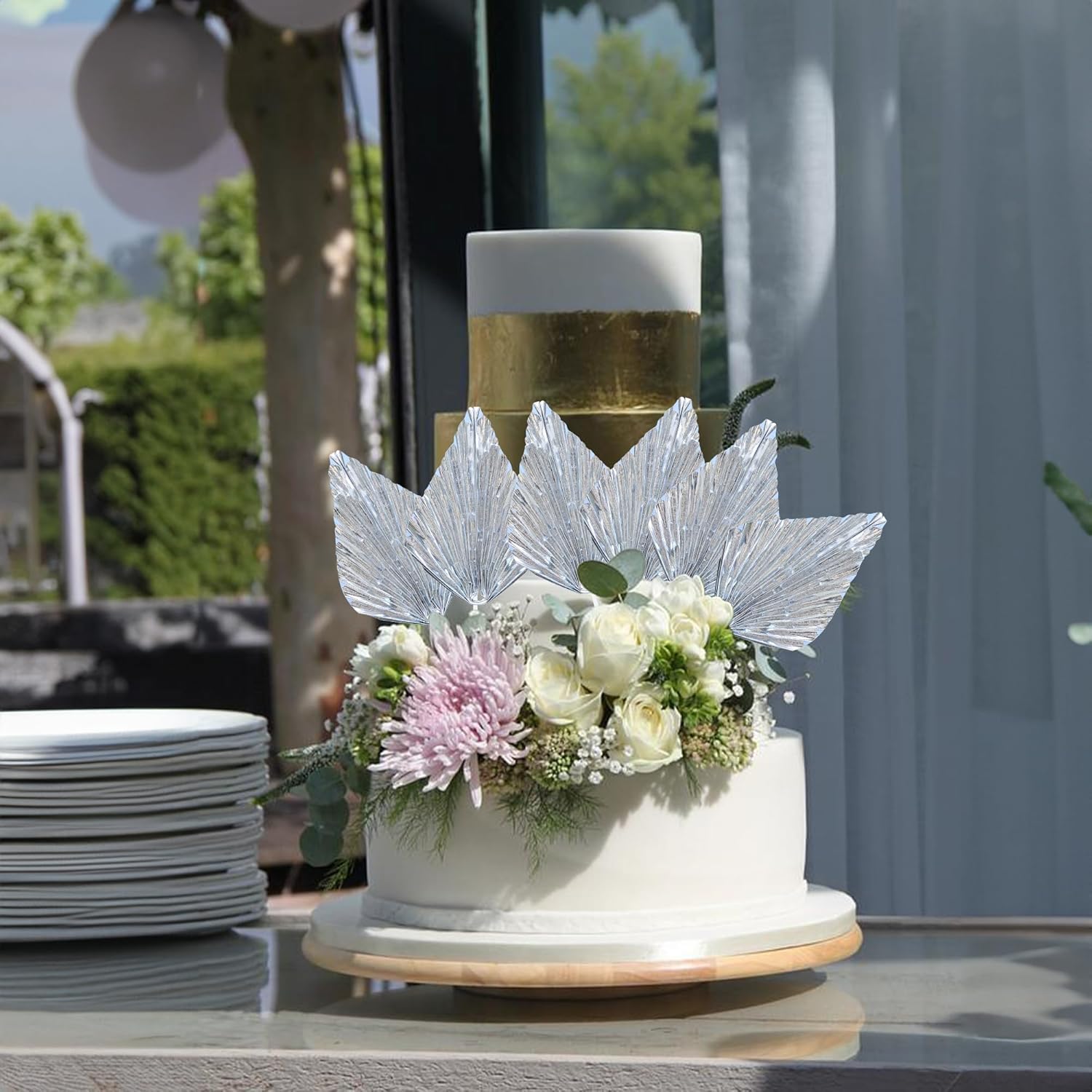 Gyufise 6Pcs Paper Palm Fan Cake Topper Palm Leaf Fan Cake Pick for DIY Bakeware Craft Project Home Made Wedding Bridal Shower Birthday Anniversary Party Cake Decorations Supplies Metallic Silver