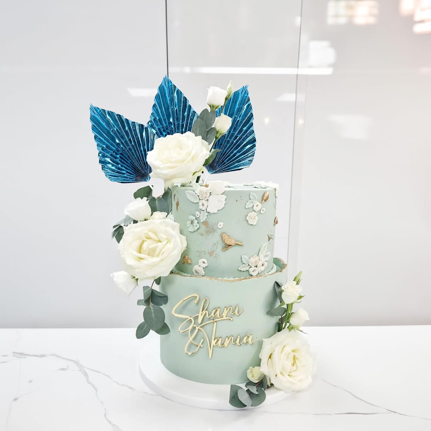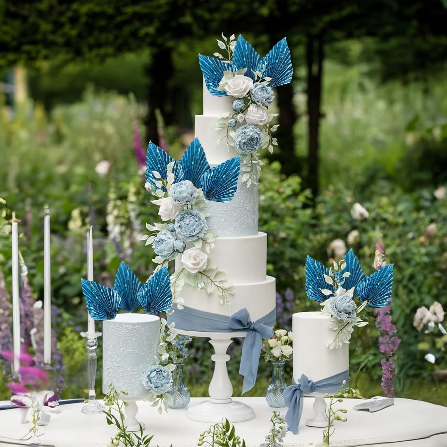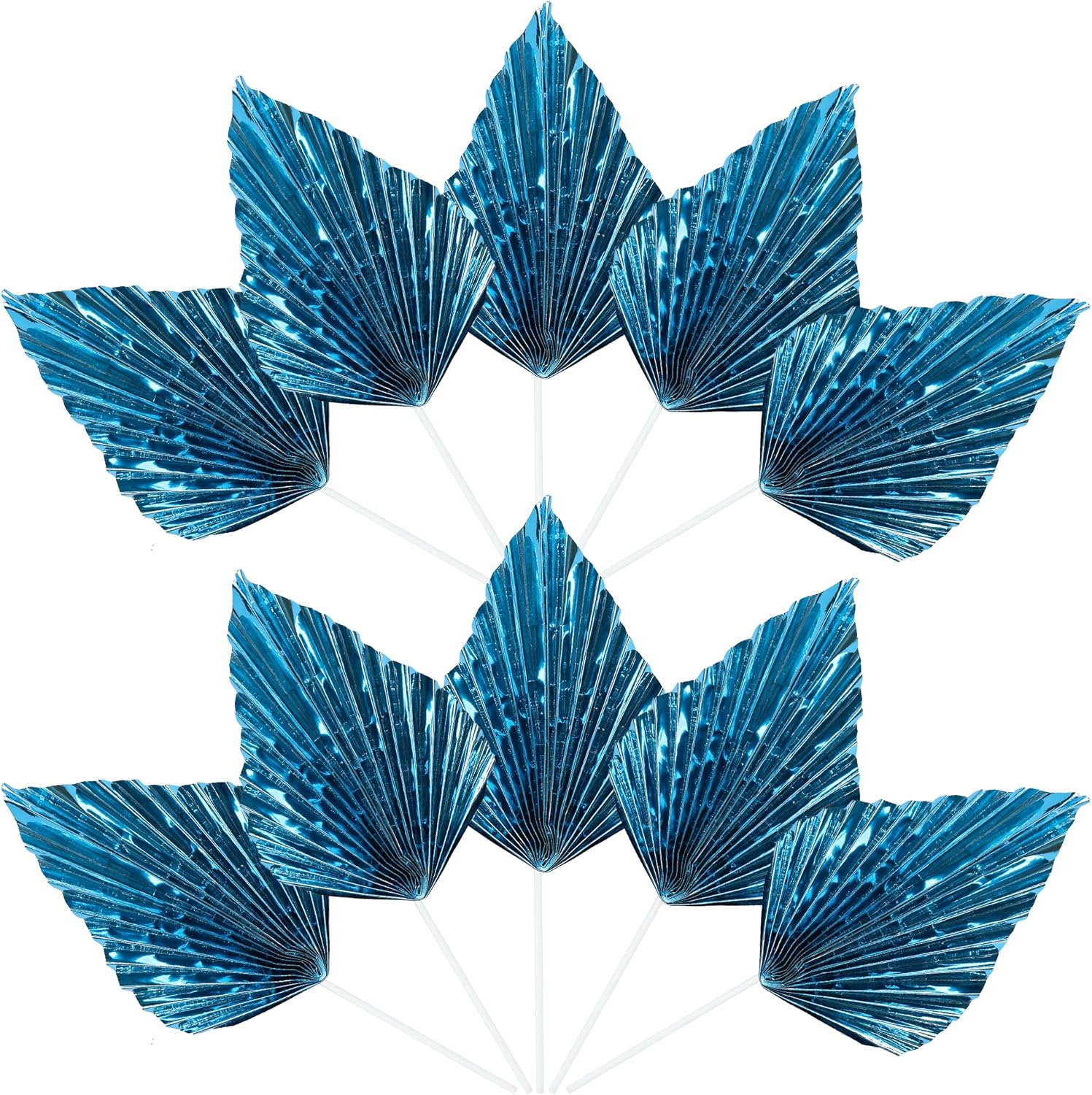 Ephlyn 6Pcs Paper Palm Leaves Fan Cake Toppers Palm Leaf Fan Cake Picks Craft DIY Fan Cupcake Toppers Palm Spear Leaves Cake Decorations for Baby Shower Wedding Birthday Party Supplies Bright Blue