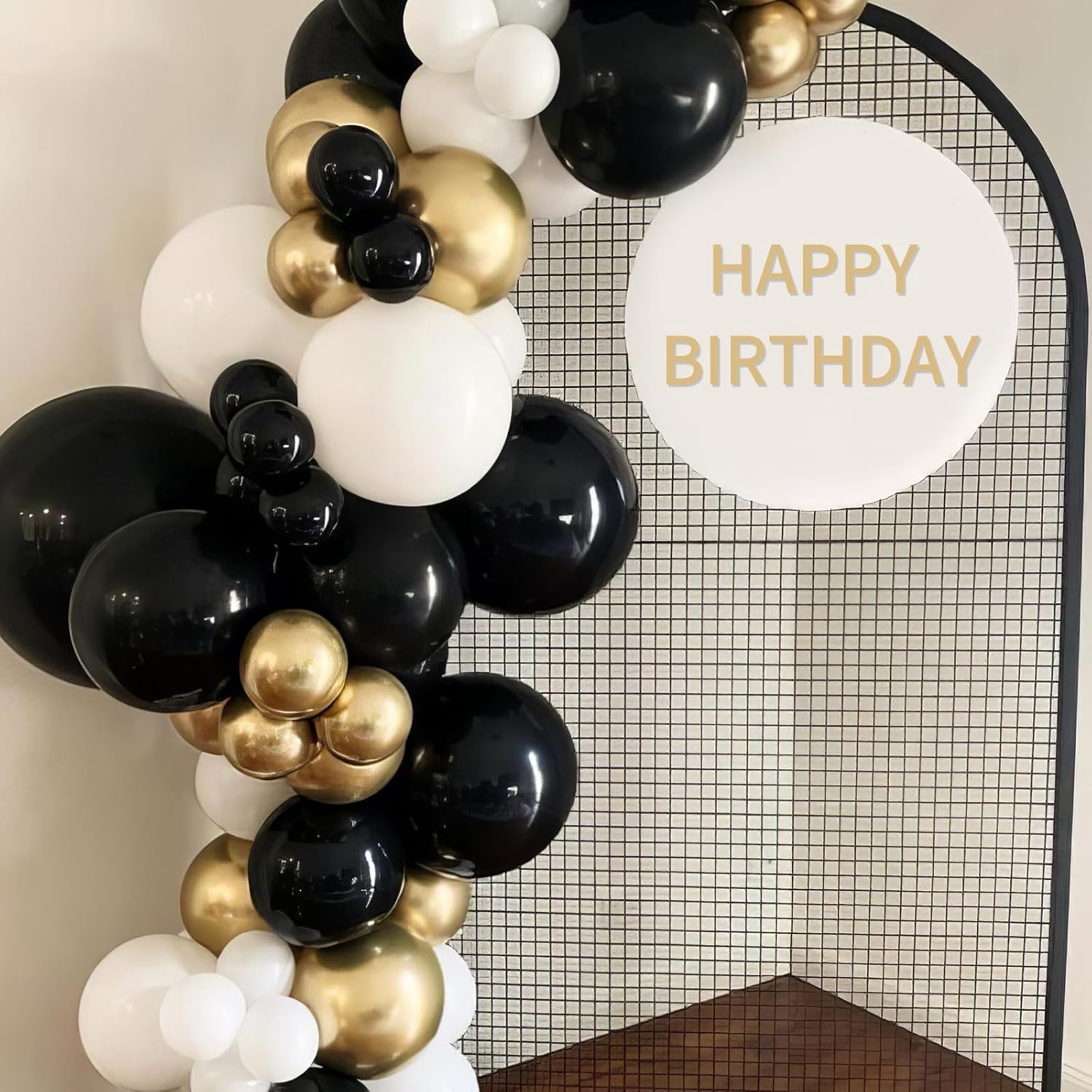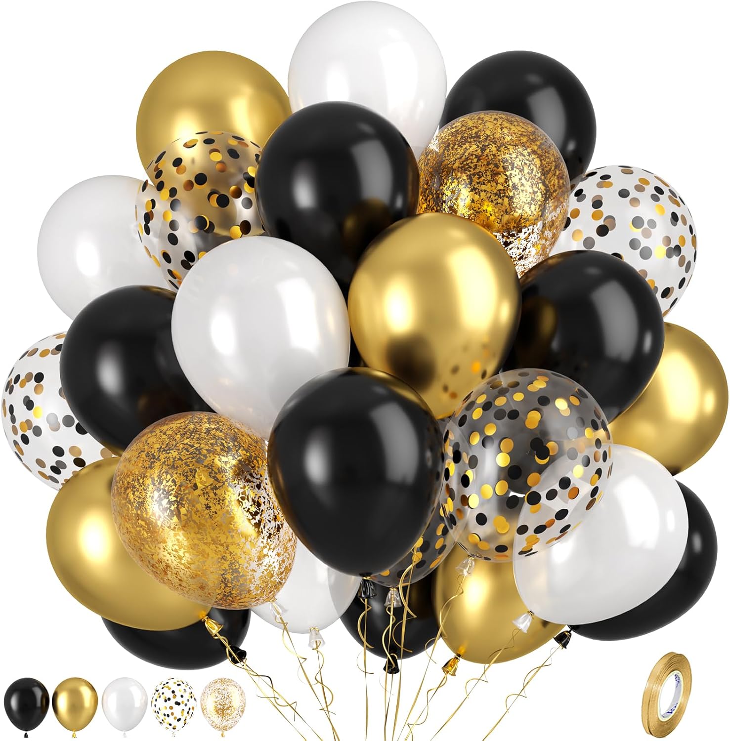 • 12 inchs Gold and Black Balloons Set: 12pcs matte black balloons, 10pcs metallic gold balloons, 8pcs gold confetti balloons, 8pcs black and gold confetti balloons, 12pcs pearl white balloons, 1pcs gold ribbon in our party balloons set. From birthday to wedding, make your events unforgettable with our top-notch, reliable balloons that add a touch of elegance and fun.