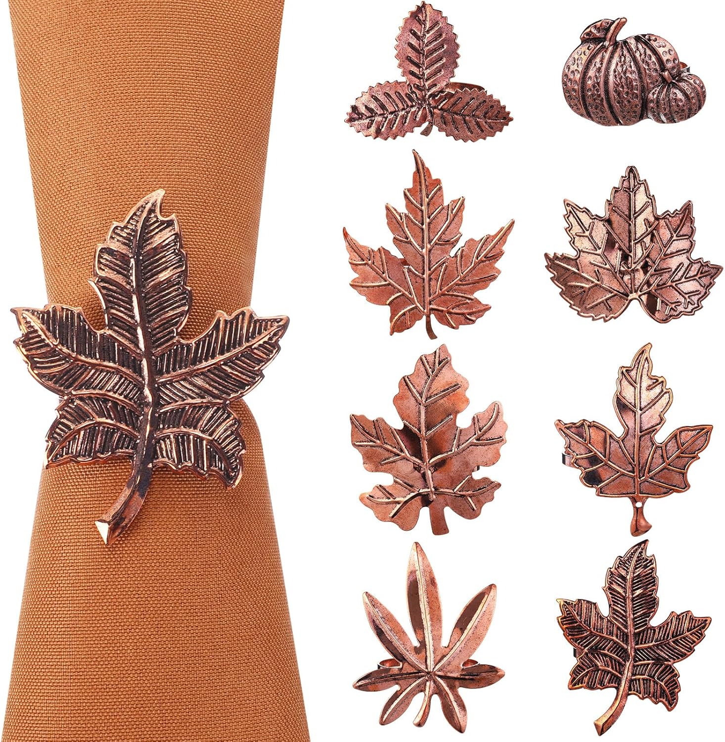 Remerry 8 Pcs Thanksgiving Napkin Ring Harvest Fall Leaf Pumpkin Holders Retro Alloy Metal Napkin Ring Buckle for Thanksgiving Wedding Table Supplies(Leaf and Pumpkin)