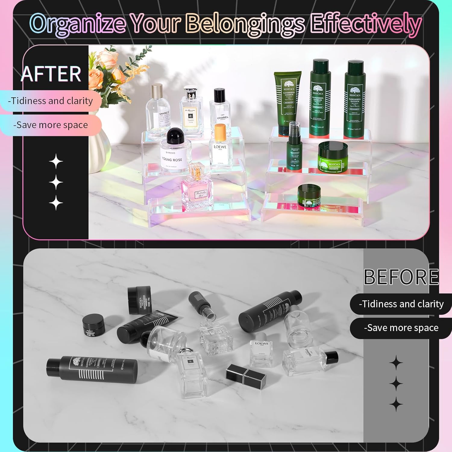 • VERSATILE USES: The iridescent display risers can meet your different needs for displaying and organizing various items such as desserts, jewelry, shoes, cosmetics, perfume,potted plants,collectibles, and more and suitable for living room, bedroom dresser, kitchen, display cabinet. Besides home use, our acrylic display stand can be used in other places, especially for birthday parties, weddings, art exhibitions, buffets and stores.