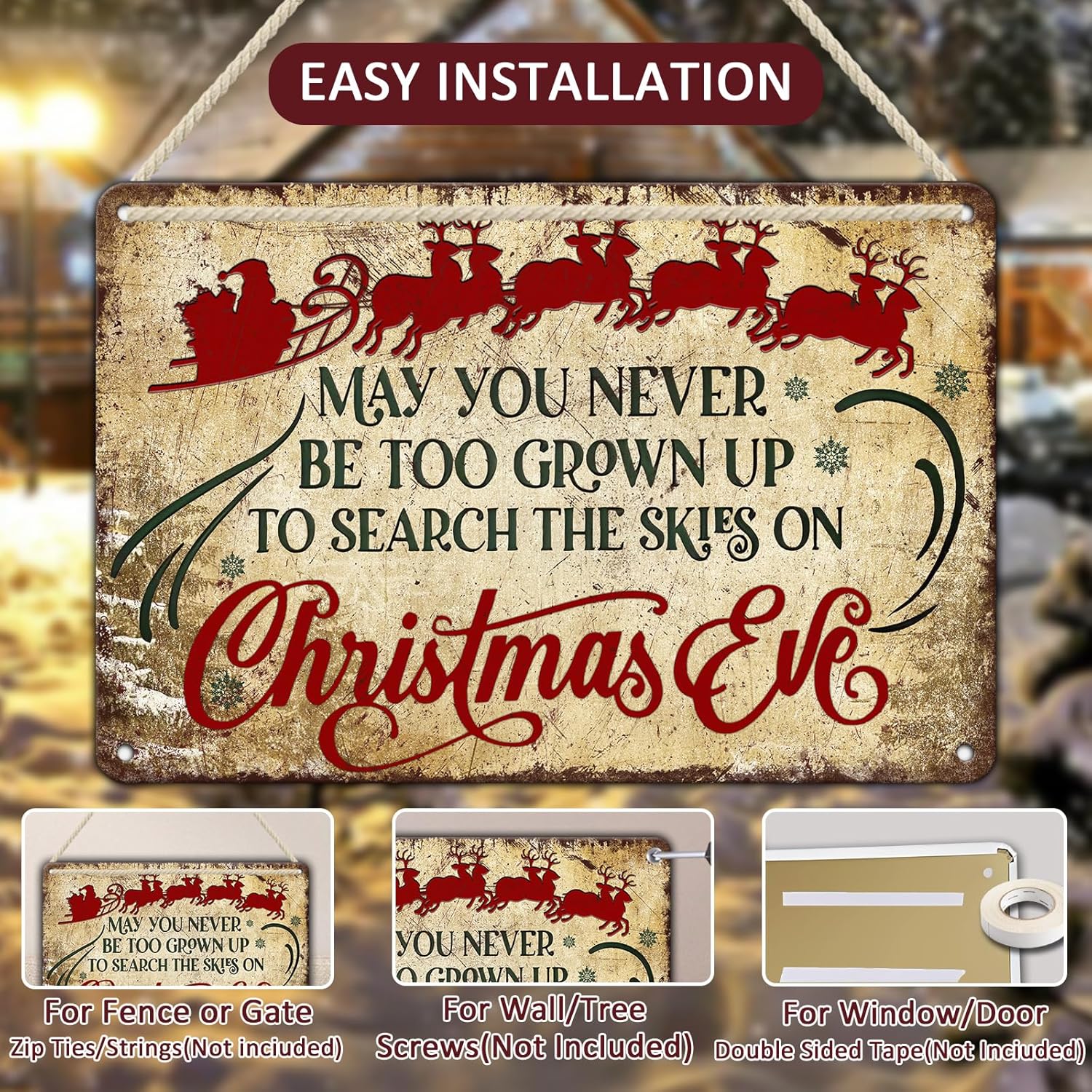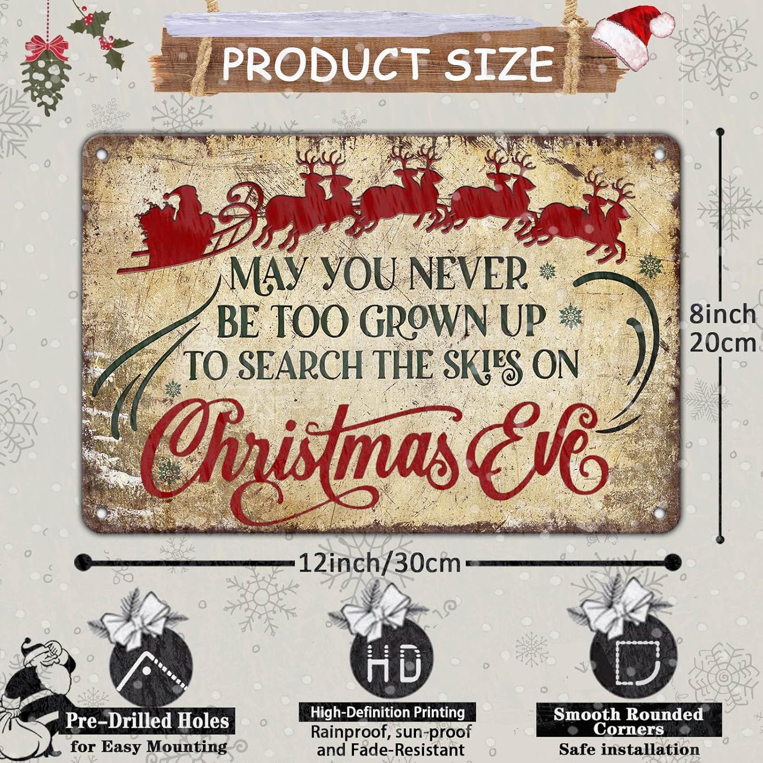 • Vintage Christmas Charm for Festive Home Decor Bring the magic of a classic Christmas to your home with our vintage sleigh design tin sign. Featuring the nostalgic quote "May You Never Be Too Grown Up to Search The Skies on Christmas Eve," this piece adds a touch of rustic wonder and heartfelt nostalgia to your farmhouse Christmas decor, creating a cozy holiday atmosphere that turns your living room into a festive sanctuary.