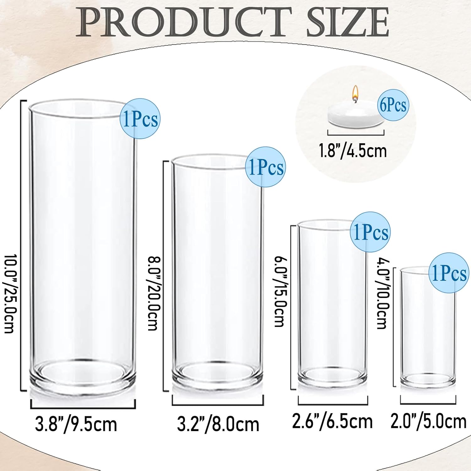 • Versatile Vases for Centerpieces: The set contains 4 pieces clear glass cylinder vases and 6 pieces floating candles, the vases height is about 4,6,8,10 inch, each size 4 pcs and the diameter is about 2.1, 2.5, 3.3, 3.7 inch, it can be meet your different needs, such as: flower arrangement, candle holders, home decor, wedding