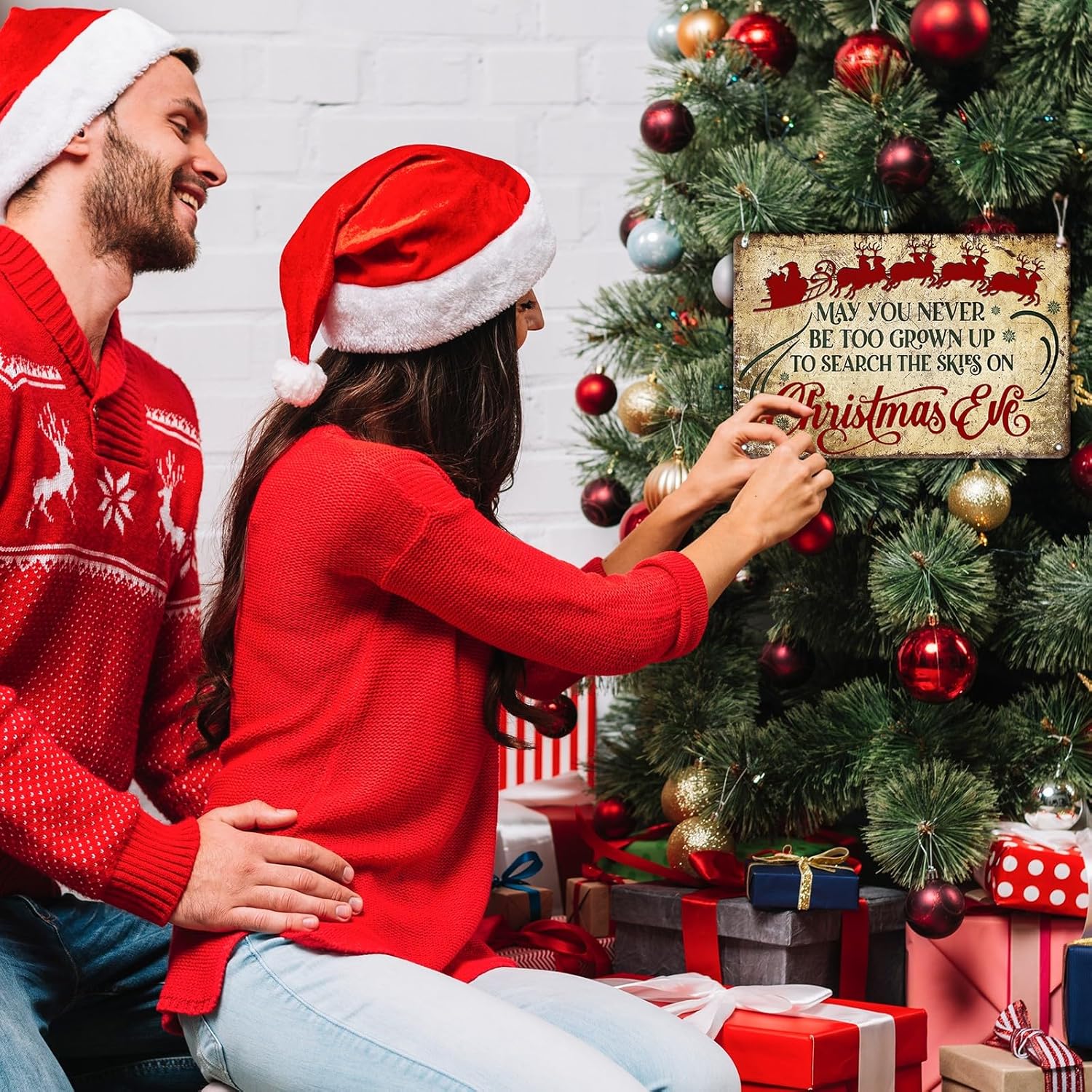 • Vintage Christmas Charm for Festive Home Decor Bring the magic of a classic Christmas to your home with our vintage sleigh design tin sign. Featuring the nostalgic quote "May You Never Be Too Grown Up to Search The Skies on Christmas Eve," this piece adds a touch of rustic wonder and heartfelt nostalgia to your farmhouse Christmas decor.