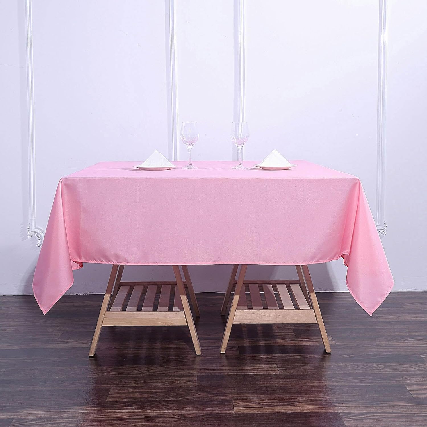 • Quantity: 1 Square Tablecloth Material: 100% Polyester Color: Pink Size: 70" x 70" High Quality: 200 GSM Stain & wrinkle resistant, machine washable 1 piece, seamless design Hemmed edges for an exquisite look. All sizes are approximate measurements Due to different light settings the actual color might vary a bit from the pictures.