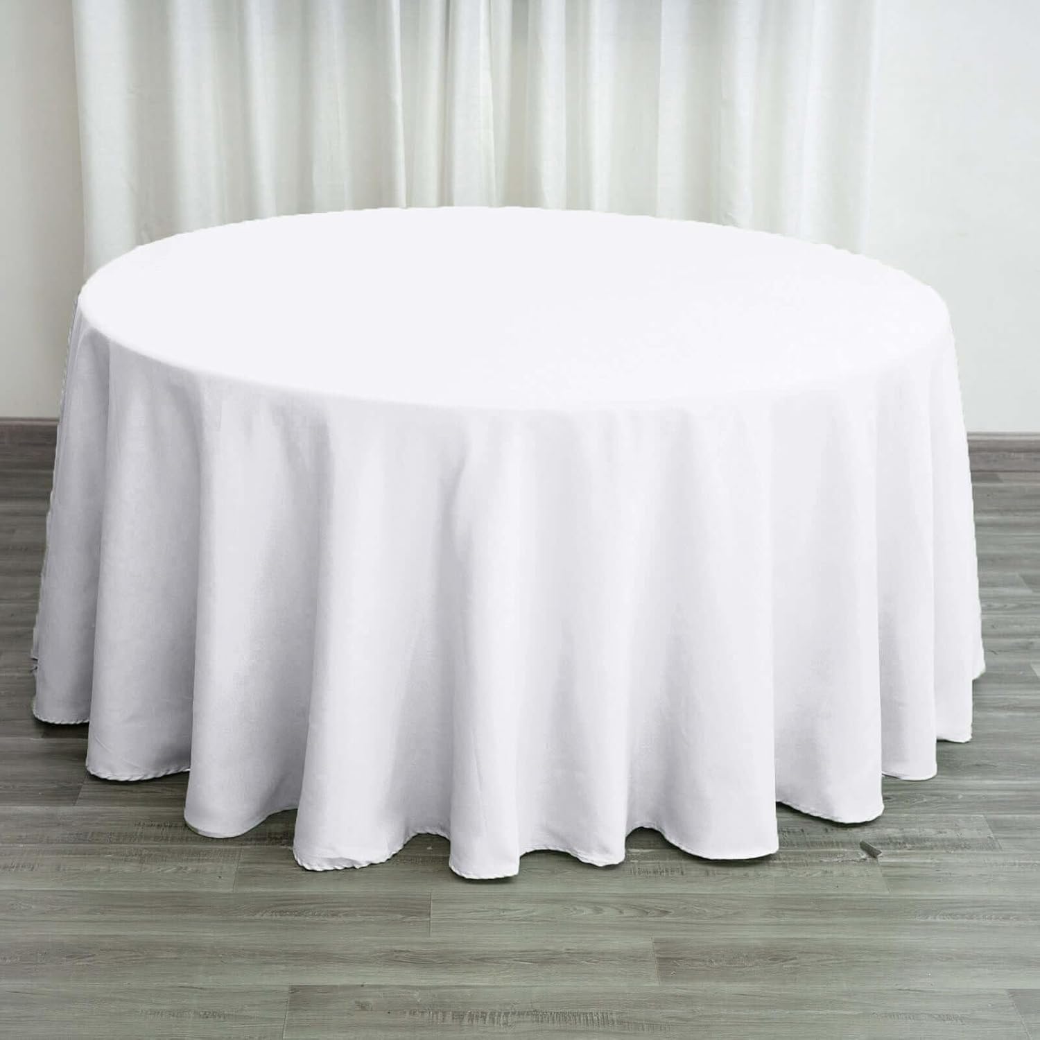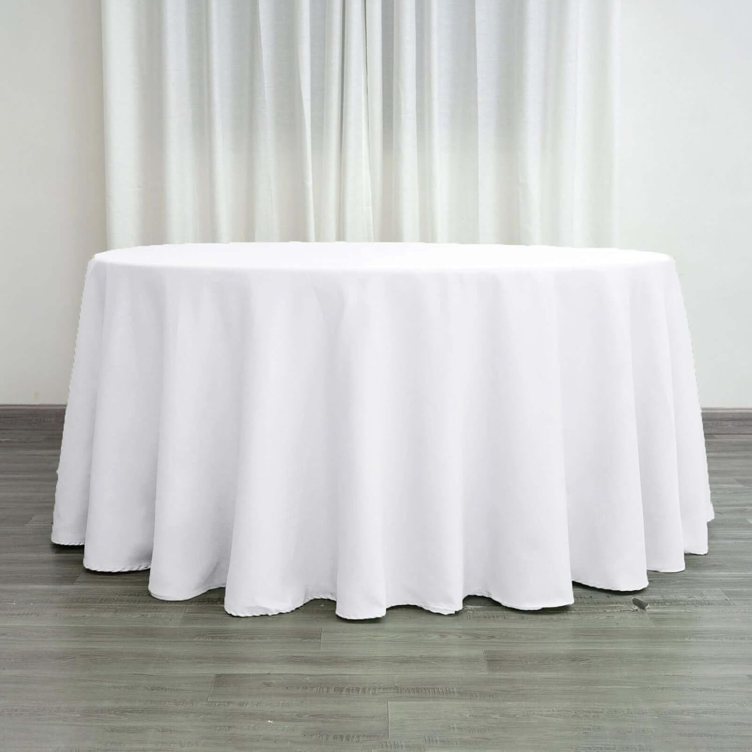 • Quantity: 1 Round Tablecloth Material: 100% Polyester Color: White Size: 120" Round Thickness: 200 GSM Stain & Wrinkle Resistant, Machine Washable 1 piece, seamless design Hemmed edges for an exquisite look. Gives floor length hang on standard 5FT (60") tables All sizes are approximate measurements