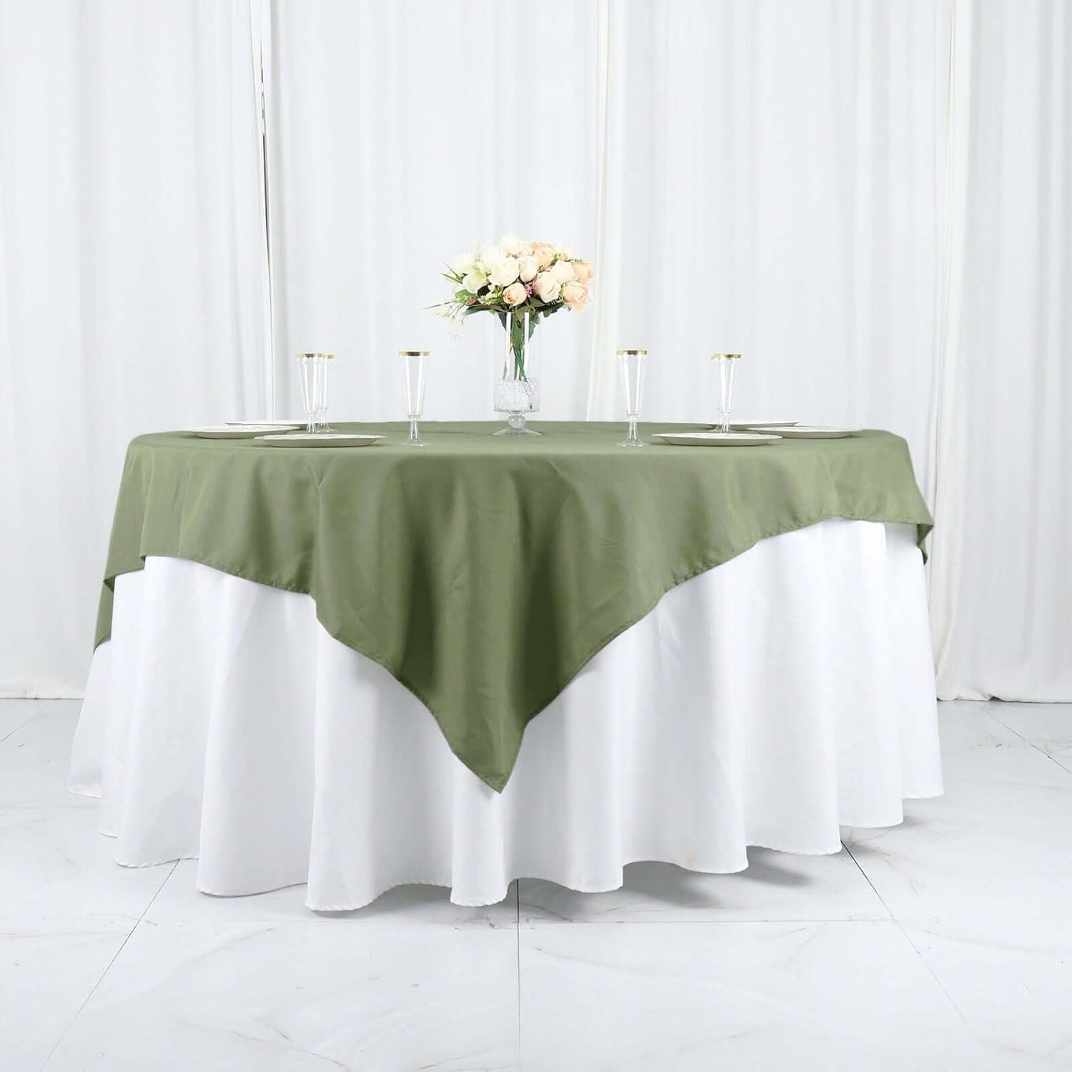 • Quantity: 1 Square Tablecloth Material: 100% Polyester Color: Eucalyptus Sage Green Size: 70" x 70" Thickness: 130 GSM Stain & wrinkle resistant, machine washable 1 piece, seamless design Hemmed edges for an exquisite look.