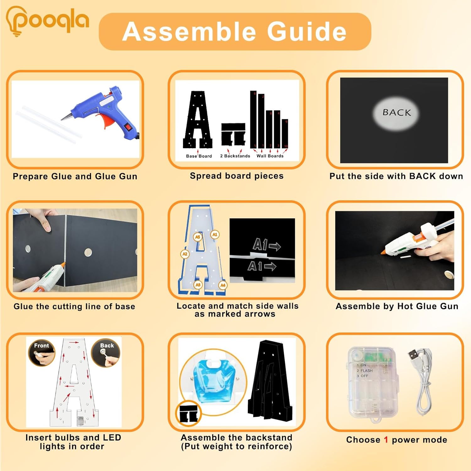 • Easy to Assemble: 1) Glue the base board, match the base and wall boards according to marked number and arrow. 2) Glue the base and wall boards together. 3) Screw the bulbs, connect LED lights and power on. Note: Glue gun, glue not included