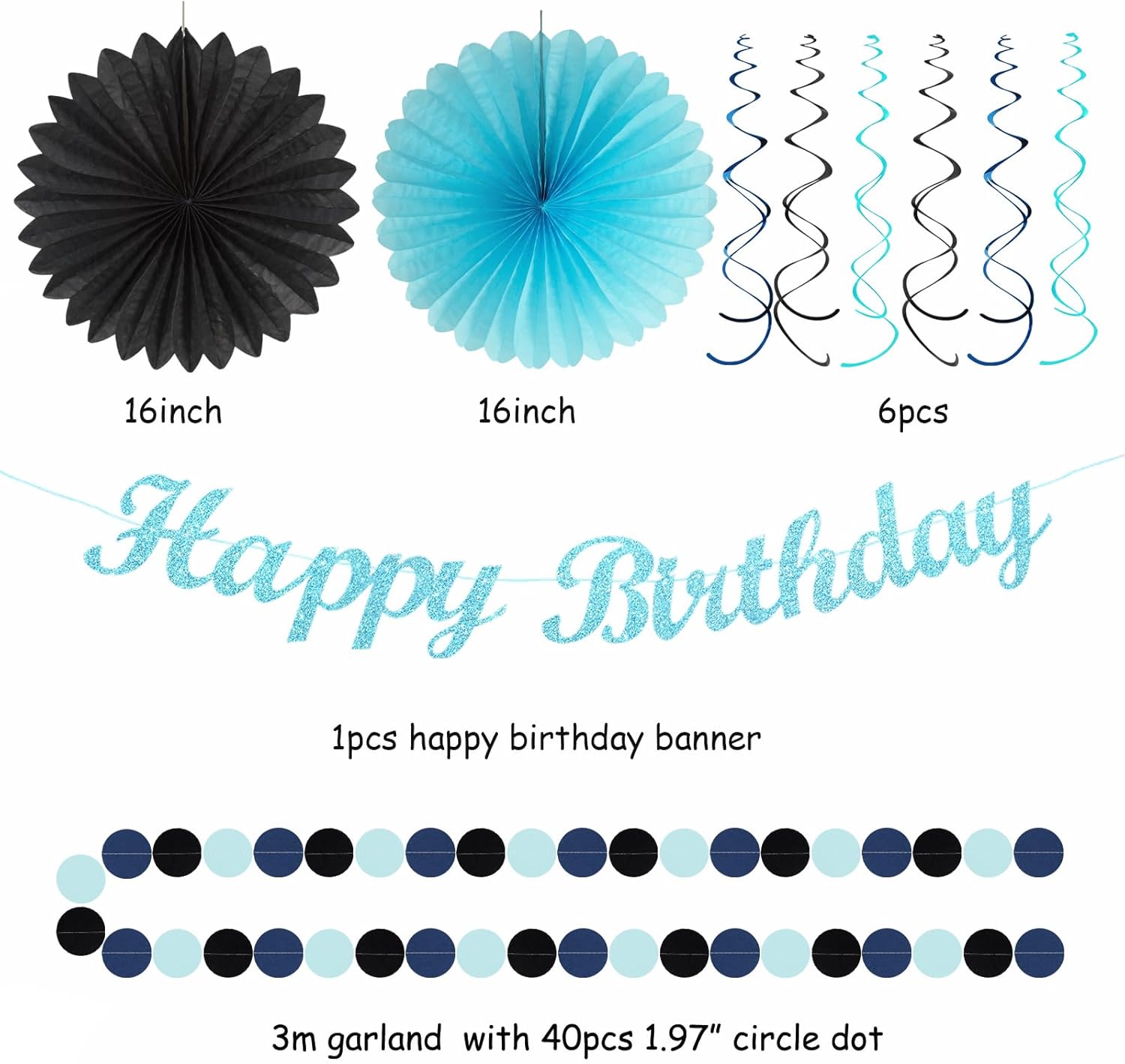 • 【Light royal navy dusty blue black Birthday kits】This kits include 1pcs happy birthday banner, 1pcs circle dots paper banner, 4pcs tissue pom poms: 3pcs 10" and 1pcs 12" , 3pcs 8inch paper honeycom ball, 2pcs 8inch paper lantern, 4pcs 12inch paper flower fan, 6pcs Paper swirls hanging streamers.