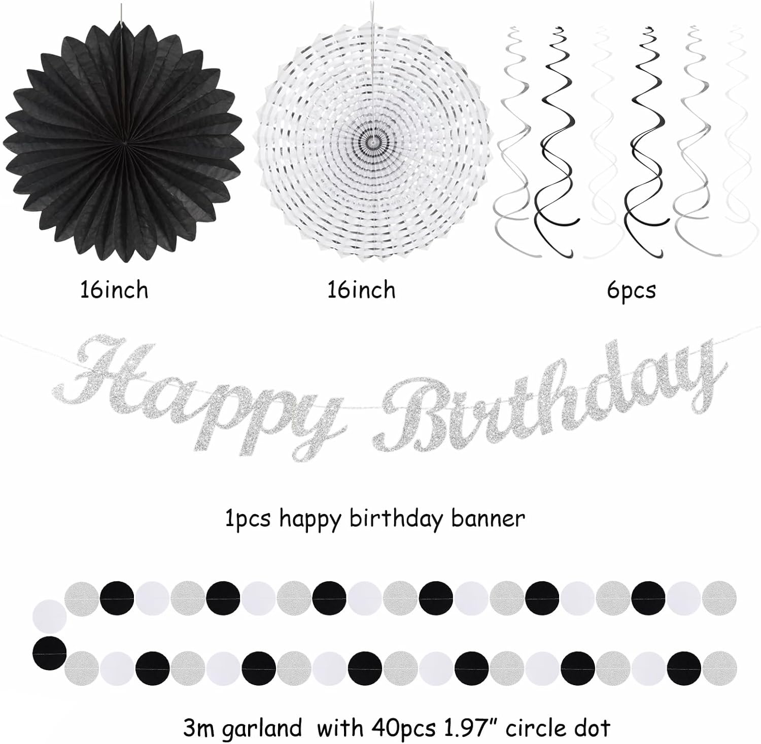 • 【Black white silver birthday kits】This kits include 1pcs happy birthday banner, 1pcs circle dots paper banner, 4pcs tissue pom poms: 3pcs 10" and 1pcs 12" , 3pcs 8inch paper honeycom ball, 2pcs 8inch paper lantern, 4pcs 12inch paper flower fan, 6pcs Paper swirls hanging streamers.