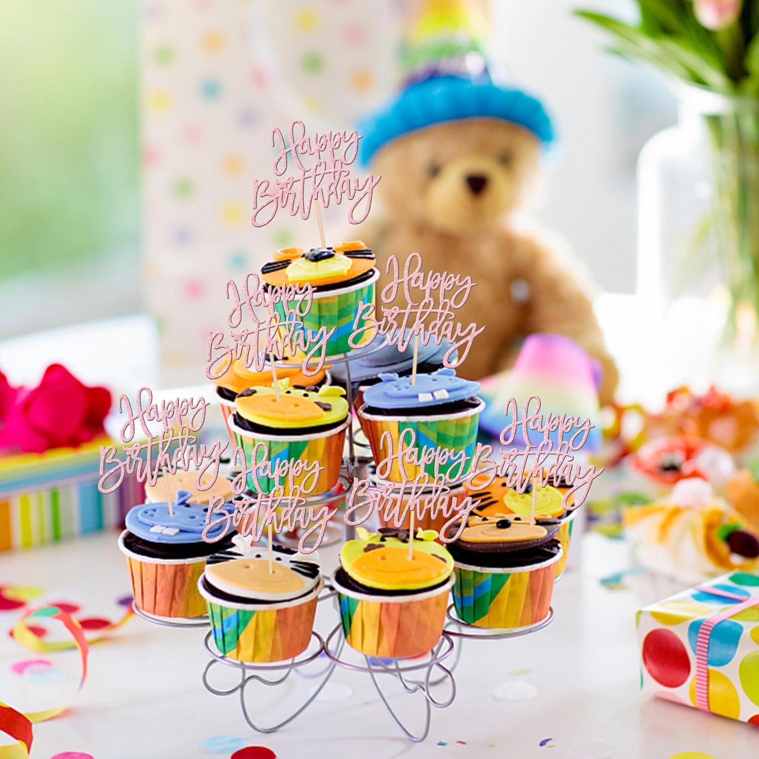 24 PCS Happy Birthday Cupcake Toppers Glitter Picks for Celebrating Anniversary Theme Party Cake Decorations Supplies Light Pink