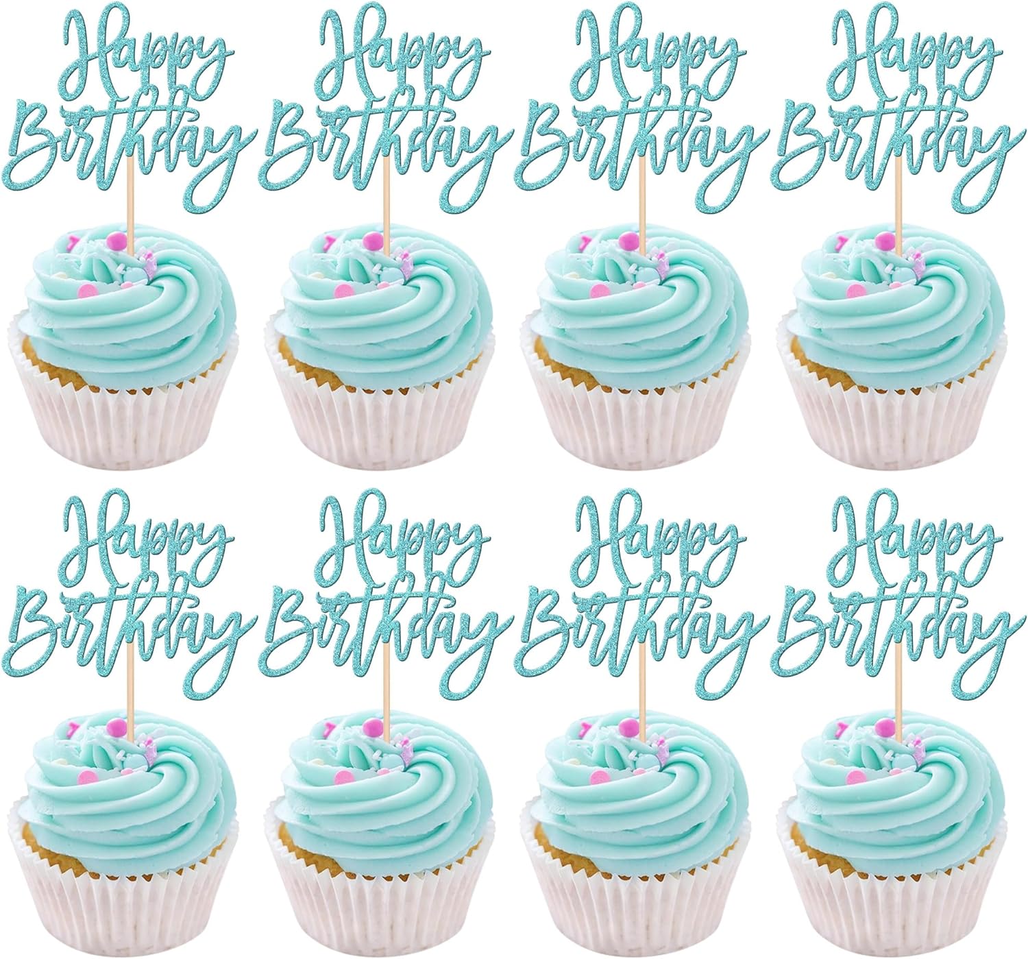 24 PCS Happy Birthday Cupcake Toppers Glitter Picks for Celebrating Anniversary Theme Party Cake Decorations Supplies Light Blue
