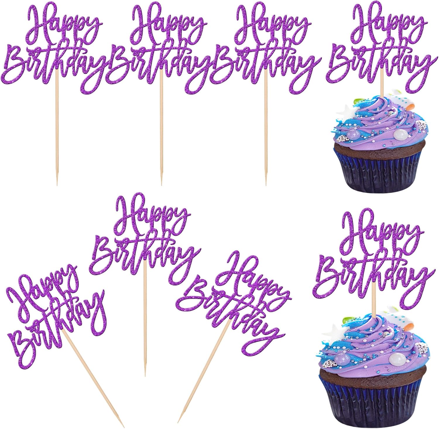 24 PCS Glitter Happy Birthday Cupcake Toppers - Purple Cupcake Picks for Celebrating Anniversary Theme Party Cake Decorations