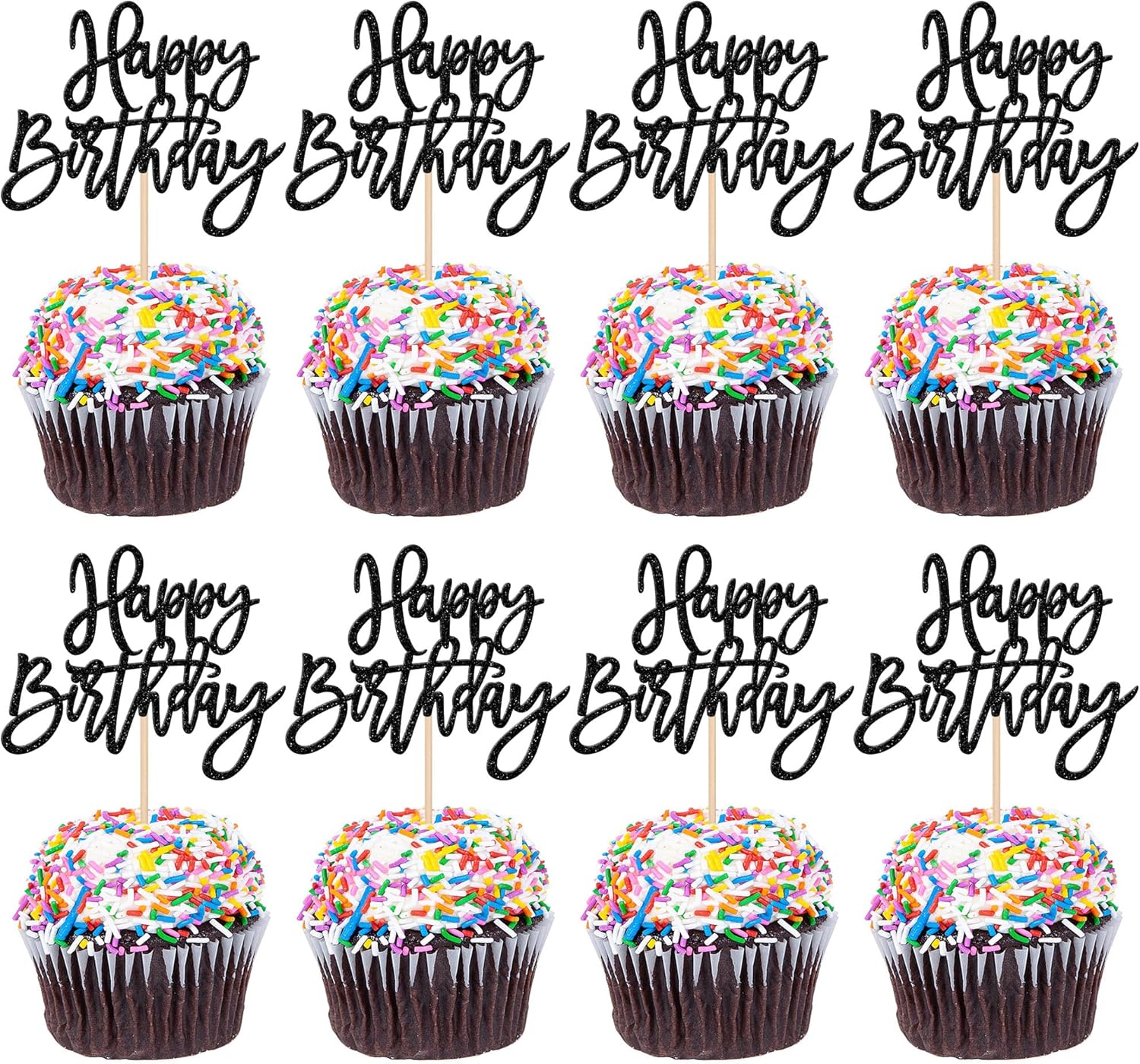 24 PCS Glitter Cupcake Toppers - Happy Birthday & Anniversary Cake Decorations - Black