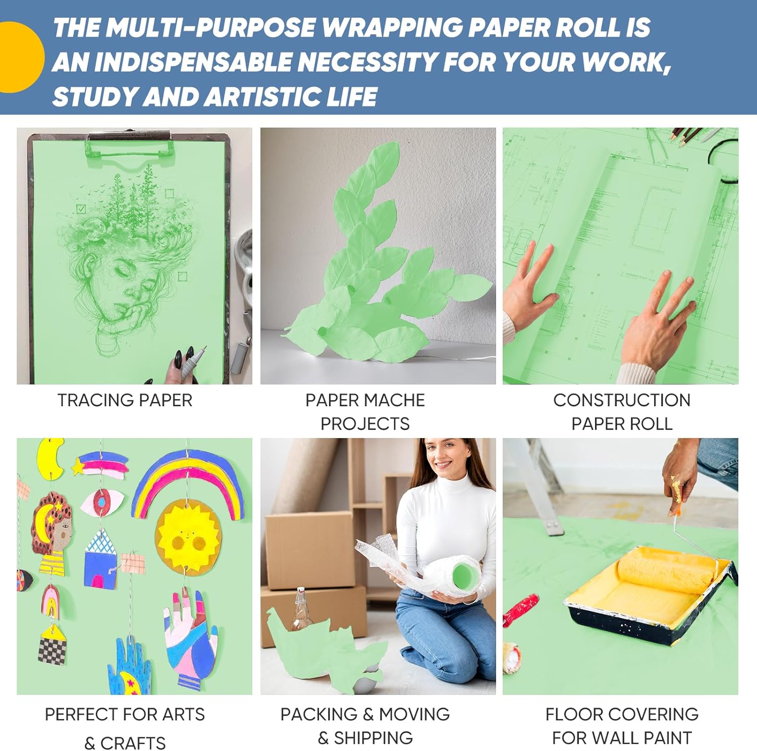 • 【Endless Light Green Packing paper】With 38 feet of packing paper in a roll, you have enough paper to complete multiple projects without having to constantly restock. It saves you time and money compared to buying smaller rolls or sheets of paper. This blank canvas is a must-have paper roll item for packing, crating, shipping, moving, mailing, postal, parcel, sublimation printing, packaging fillers, table runner and floor coverings