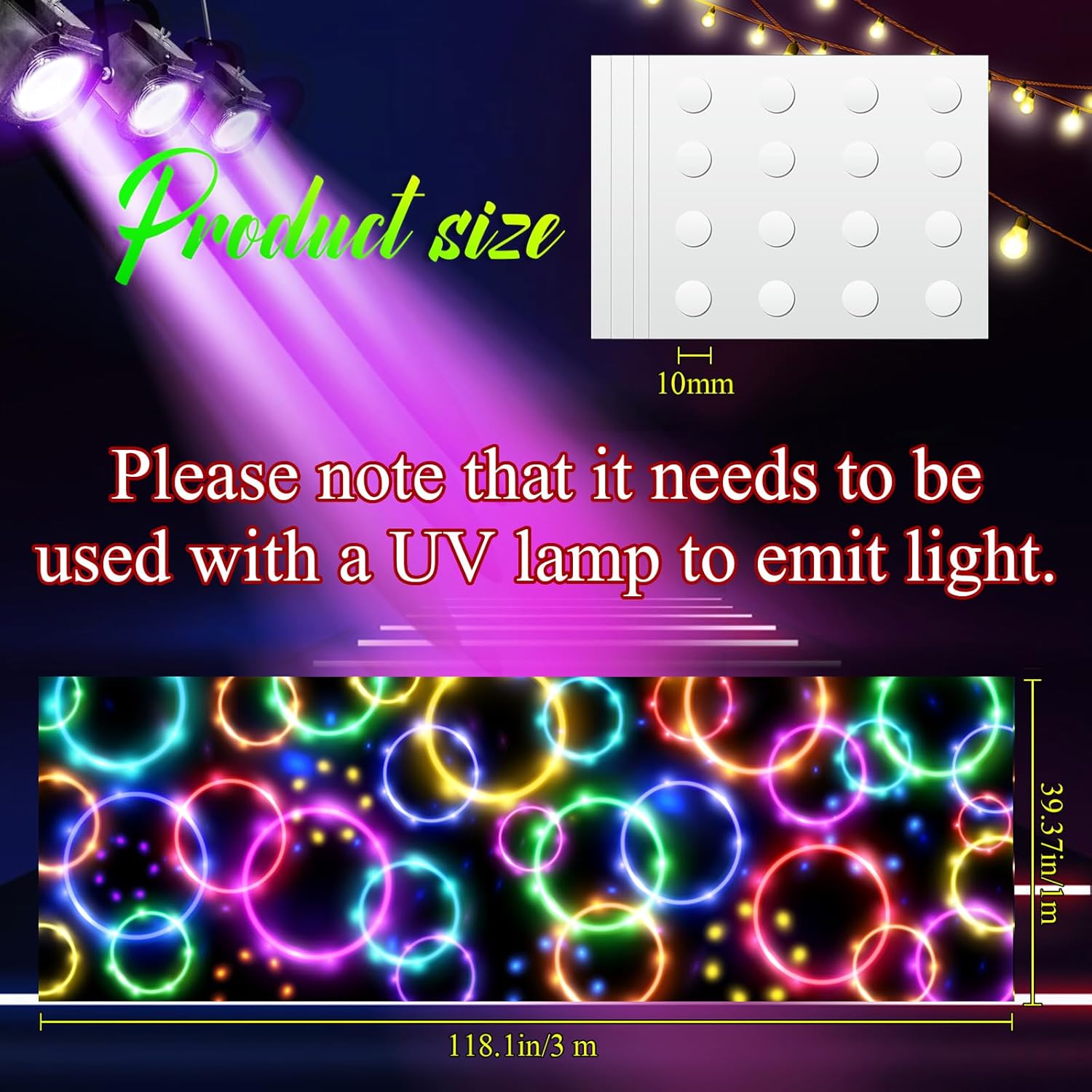 • Bright Fluorescent Color: the neon floor carpet shines brightly under UV blacklight, with fluorescent orange, fluorescent red, fluorescent green, fluorescent yellow, fluorescent blue and fluorescent pink circles staggered against each other, making it simple to draw the attention of others; Please note that it will have the effect of fluorescence, but it needs to be irradiated by purple lamp to have the effect; If it is not irradiated, it is a normal pattern