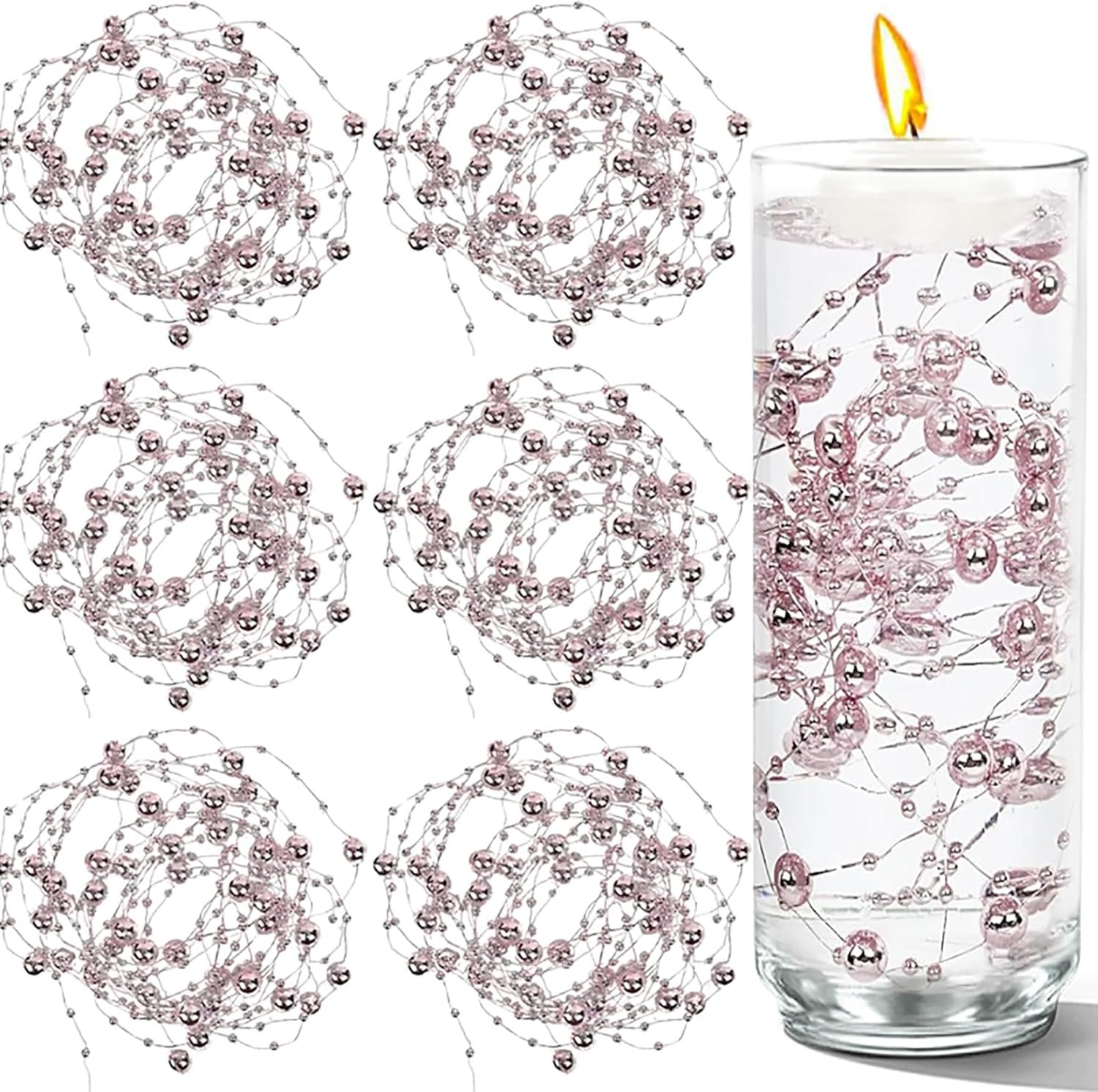 • Pearl String Beads: These artificial fake pearls strands are designed for floating candles, easy to use, just fill the string beads into the floating candle glass candle holders; you can also fill the vase with water and add 2 or 3 strands of beads string, which will make the centerpiece more romantic and gorgeous, for tall or large vases, just fill it with more strands of pearl decorations to bring a rich and luxurious look to your precious vase filler
