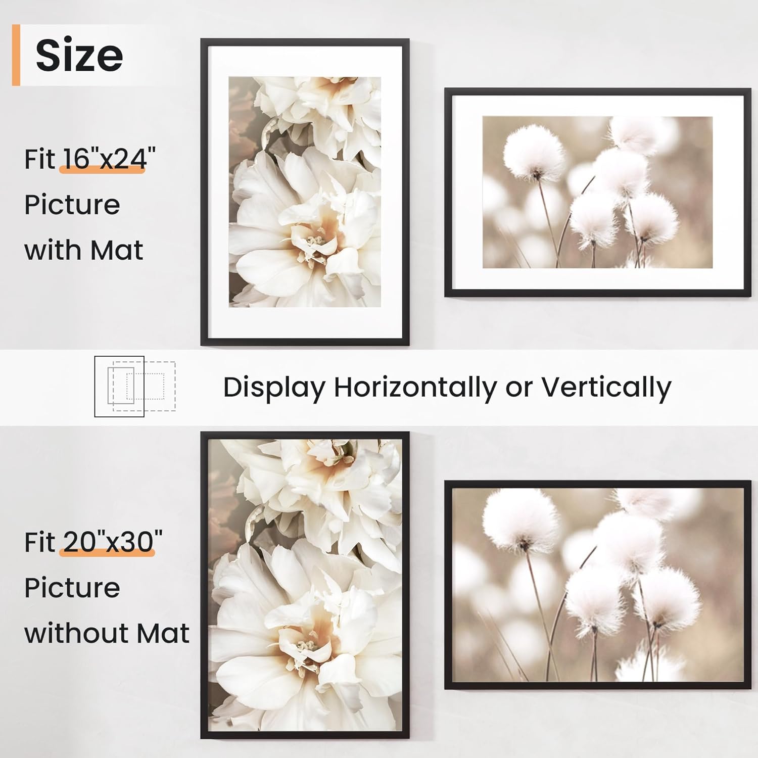 • Display Precious Memories - Showcase your cherished moments with our 20x30 plastic frame. It's lightweight yet sturdy with a superior quality finish. The white mat opening (measuring 15.5x23.5) is perfect for a 16x24 picture with the mat, or an 20x30 picture without it.