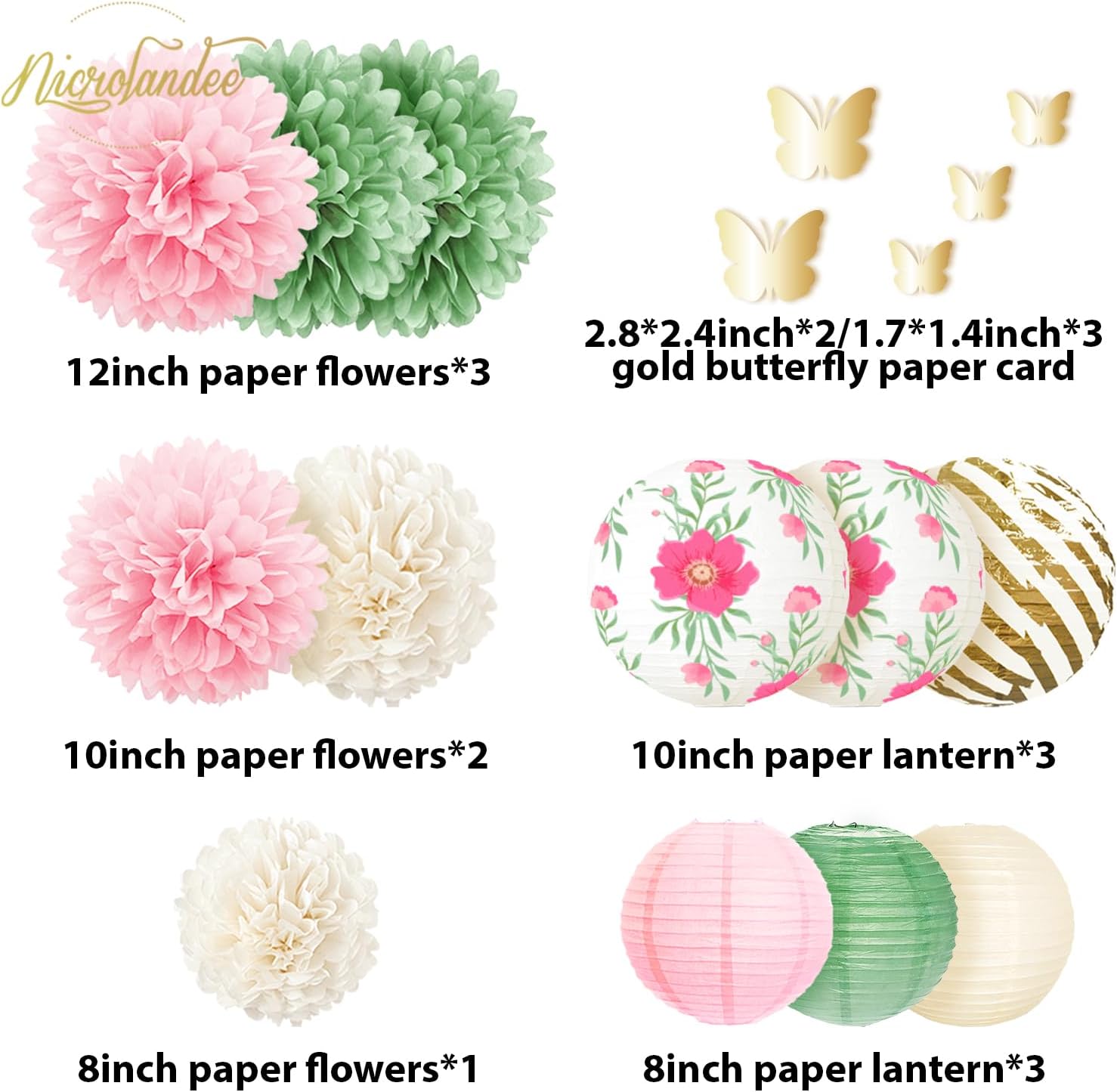 NICROLANDEE Wedding Party Decorations, 12 PCS Green Pink Blooms Paper Lanterns Tissue Pom Poms for Fairy Birthday Party Decorations, Foil Gold Butterfly Baby Bridal Shower Spring Easter Party Decor
