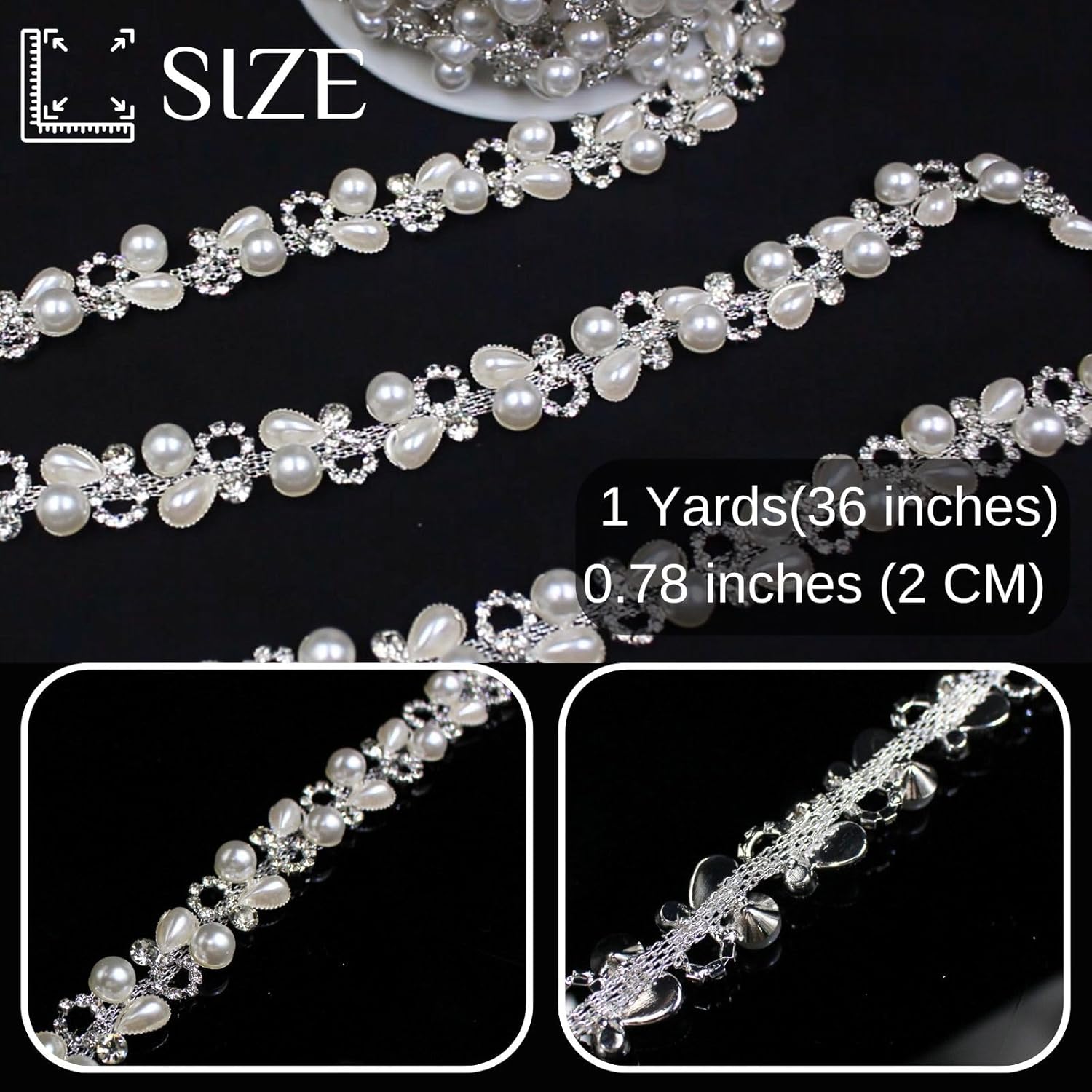 • Size: You will receive one roll of rhinestone chain, approximately 1 yard long and 0.78 inches (2 cm) wide, which is sufficient to meet your various decoration needs. You can also share it with friends or family. It's perfect for sewing trim and embellishments, and pearl garlands are also a great choice