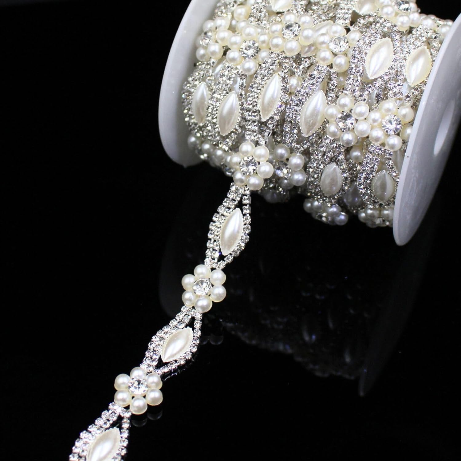 1 Yard Pearl Rhinestone Trim Chain Silver String Crystal Applique Fringe Ribbon Strips Beads Sewing Dress DIY Party Wedding Bouquet for Decoration Bridal Costume Embellishment