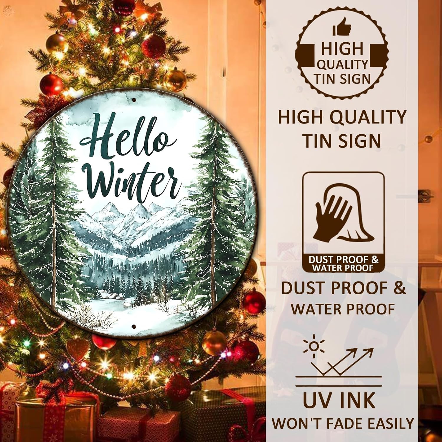 Round Christmas Metal Tin Sign Hello Winter Sign Christmas Pine Trees Welcome Door Sign Xmas Winter Holiday Farmhouse Rustic Wreath Sign for Indoor Outdoor Home Wall Window Decor 8 * 8 in
