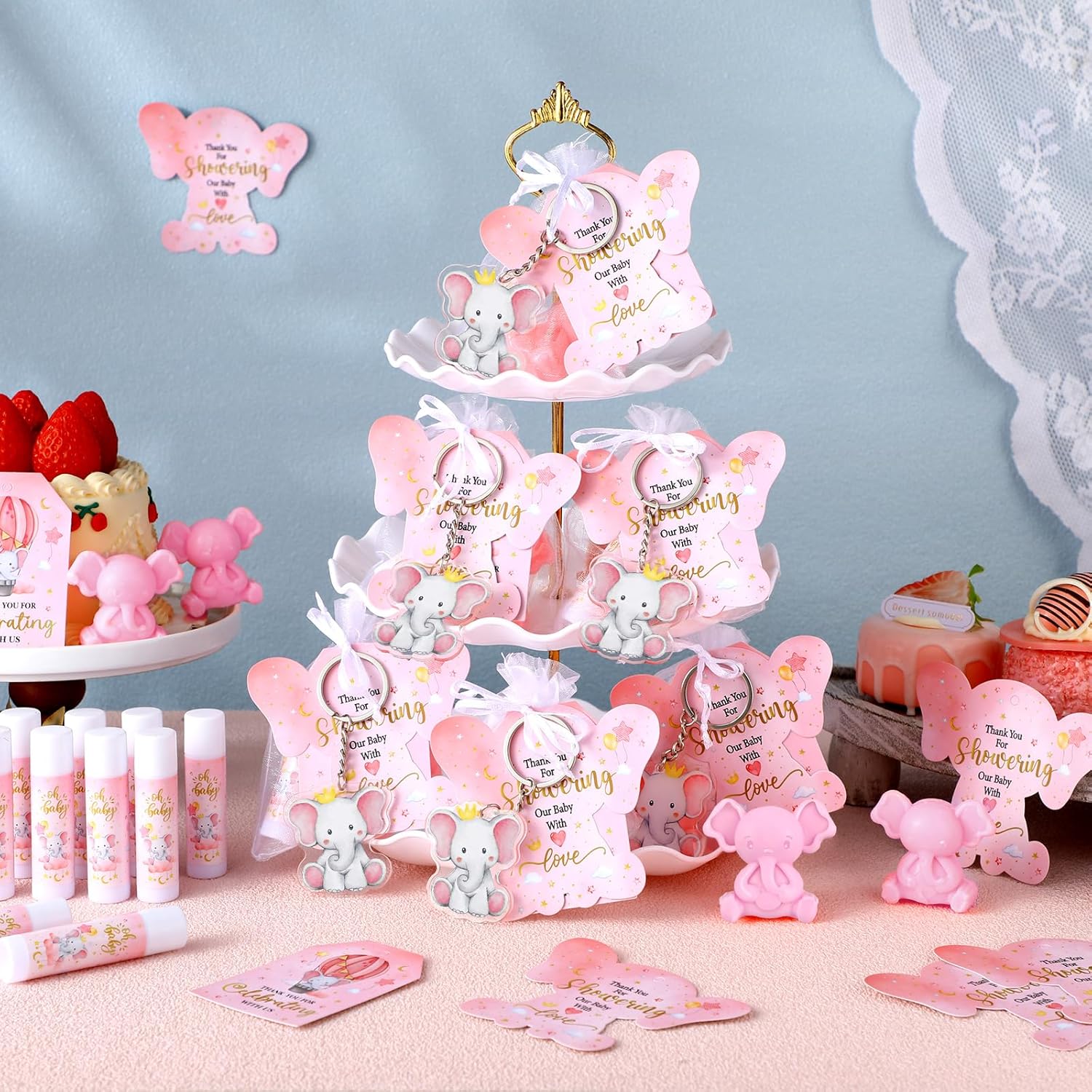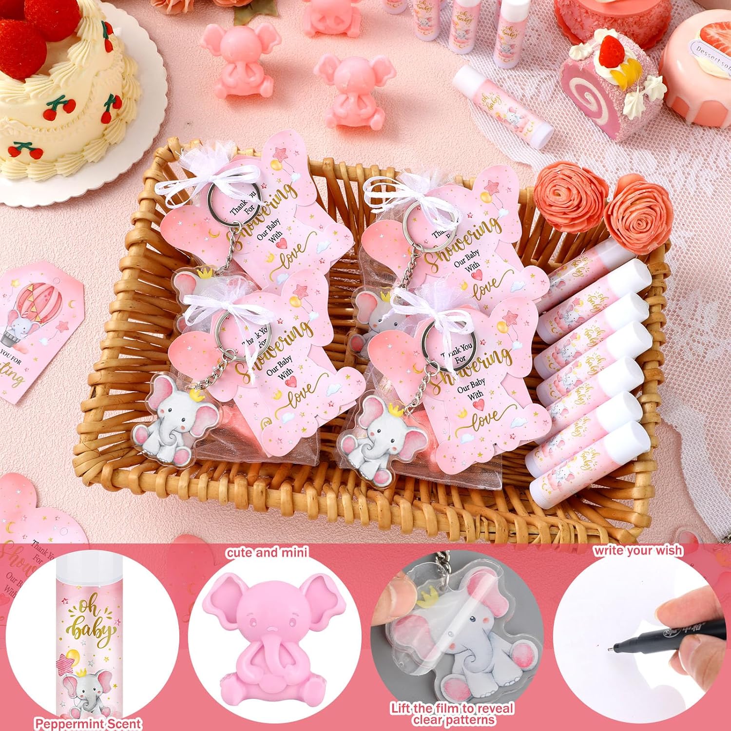 288 Baby Shower Favors Baby Shower Gifts Bulk Lip Balms Soaps Keychains Organza Bags Guest Appreciation Gift with Thank You Tags and Cards for Boys Girls Guest Gift(Pink,Elephant)