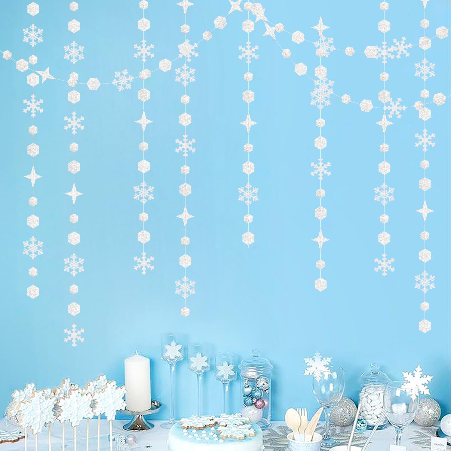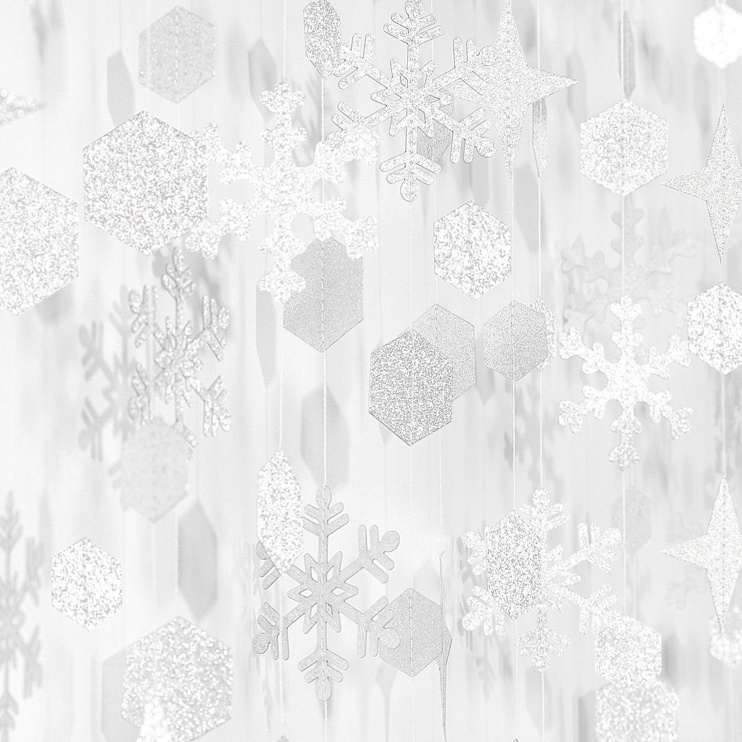 • PACKAGE CONTAINS: This set has four iridescent holographic snowflake paper garland,the length of each strand is 4 meters/13 feet, the total length is 16 meters/52 feet.The snowflake size 2.8IN,quadrangle size2.8IN,hexagon size1.6IN and 1.2IN.
