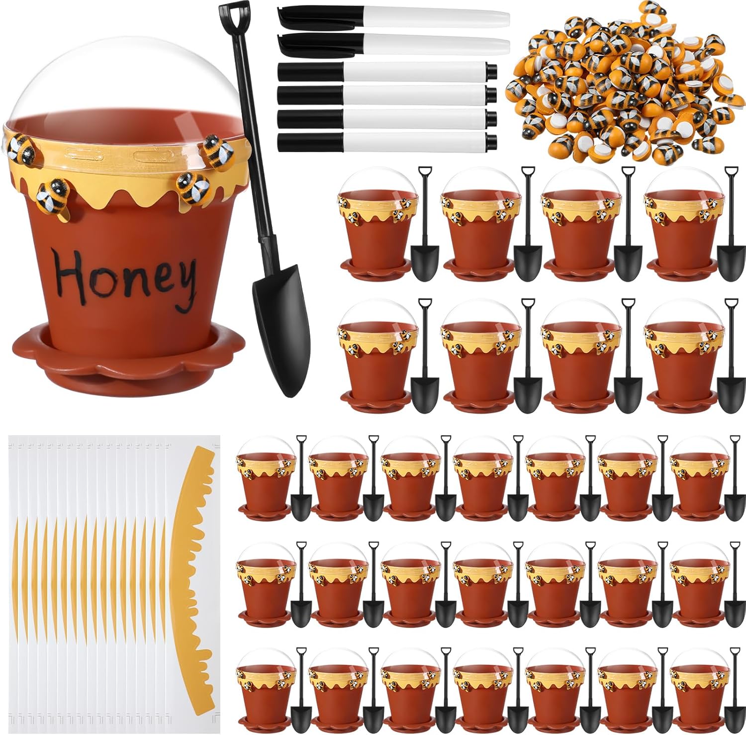 • Package Contains: includes 30 mini honey bee pots, 30 lids, 30 saucers, 30 shovel shaped spoon, 30 stickers, 120 wooden yellow bee decorations, 4 erasable markers, 2 indelible markers, ideal for DIY gifts, unleash your artistic talent to create a special and vibrant display, add fun to your bee party, birthday party, baby shower