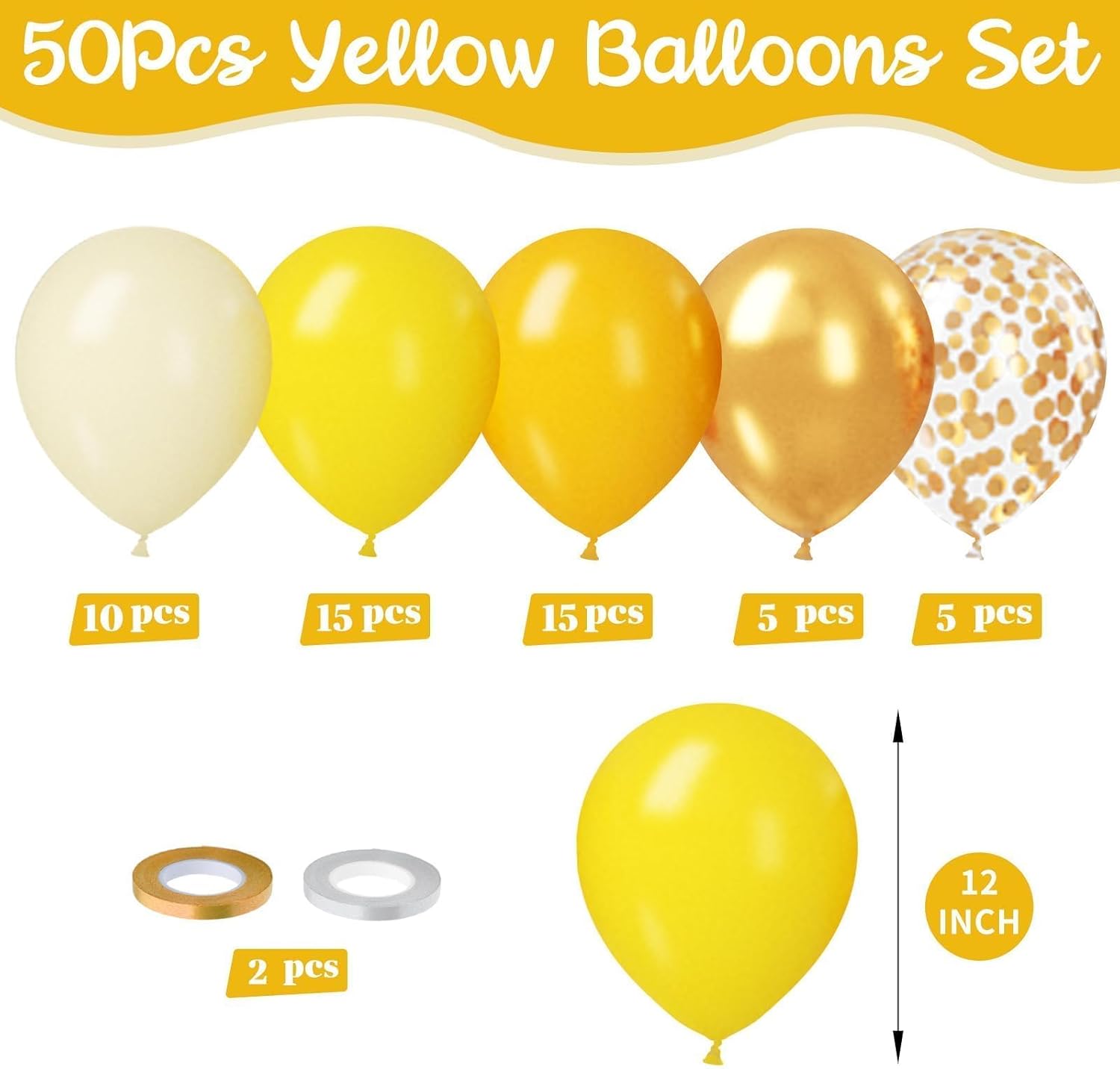• 【WHAT YOU WILL GET】Our birthday party balloons include 50pcs yellow and gold balloons, designed to help you create stunning decoration: 15 x yellow balloons, 10 x macaron yellow balloons, 15 x retro lemon yellow balloons, 5 x metallic gold balloons, 5 x confetti gold balloons, 1 x white ribbon, and 1 x yellow ribbon. The size of the balloon is about 12 inches after inflation. The combination of yellow and gold can make party or occasion more classy.