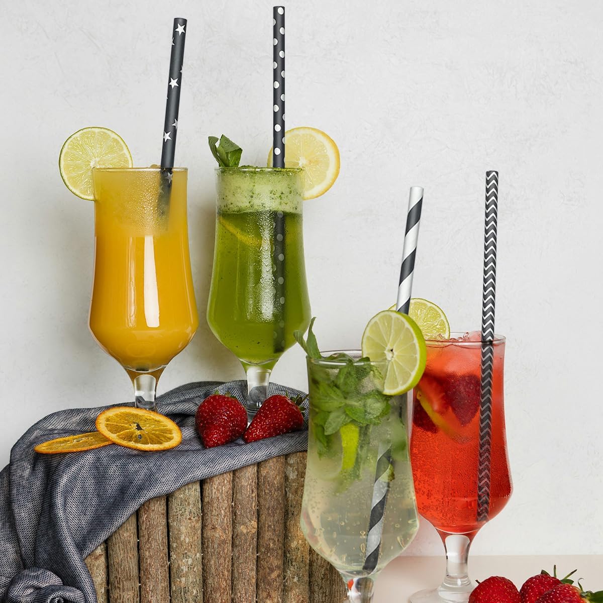 • Black Paper Straws: Includes 200 pcs black paper straws, 4 designs, black wave, black and white strip, black round, black star, these paper straws add a touch of glamour and sophistication to any party, perfect for Halloween, birthdays, Christmas, weddings, Happy New Year and other parties, holiday celebrations.