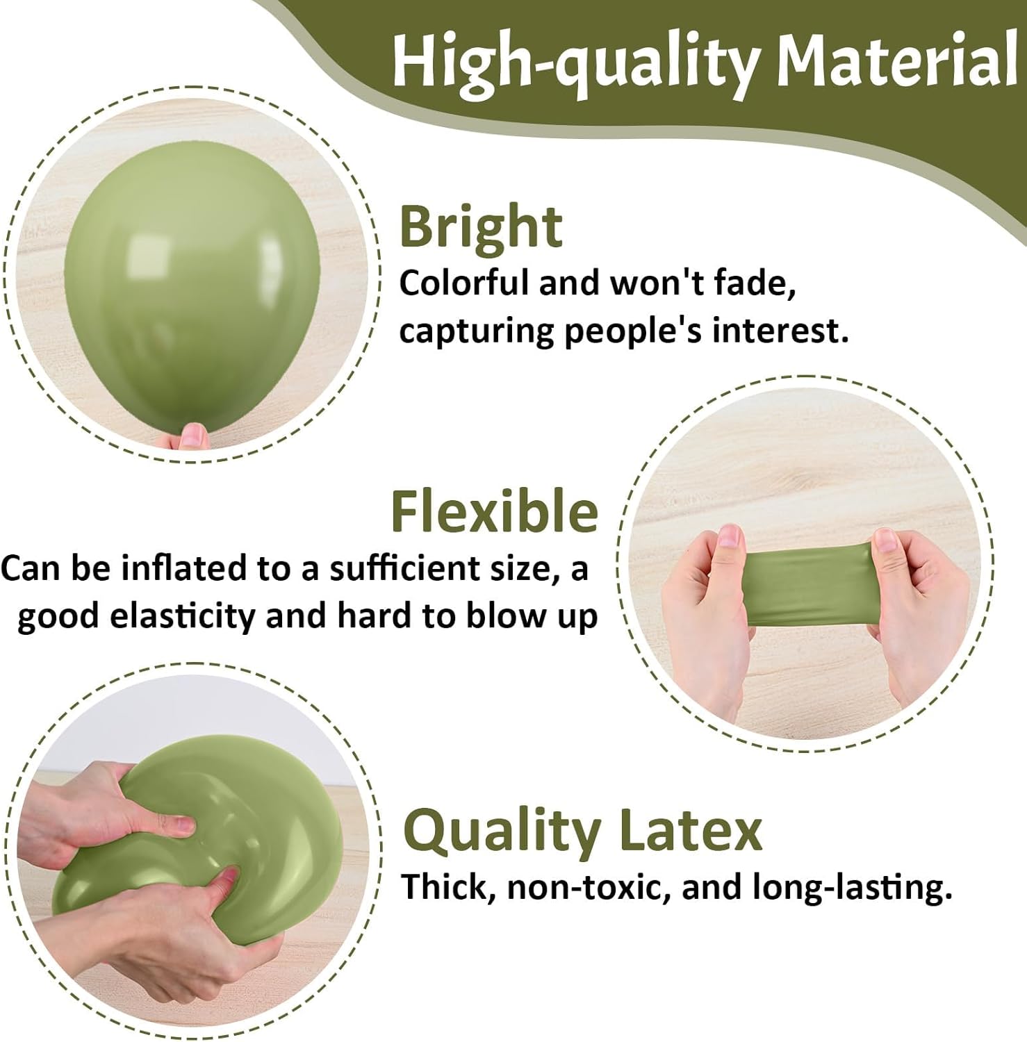 • What You Get - The sage green balloons include 50 balloons, 4 distinct colors: avocado green balloons x 22, sand white balloons x 18, metallic gold balloons x 5, confetti gold balloons x 5. Accompanying by a 10m ribbon. These striking and captivating hues will beautifully enhance your memorable and enjoyable moments!