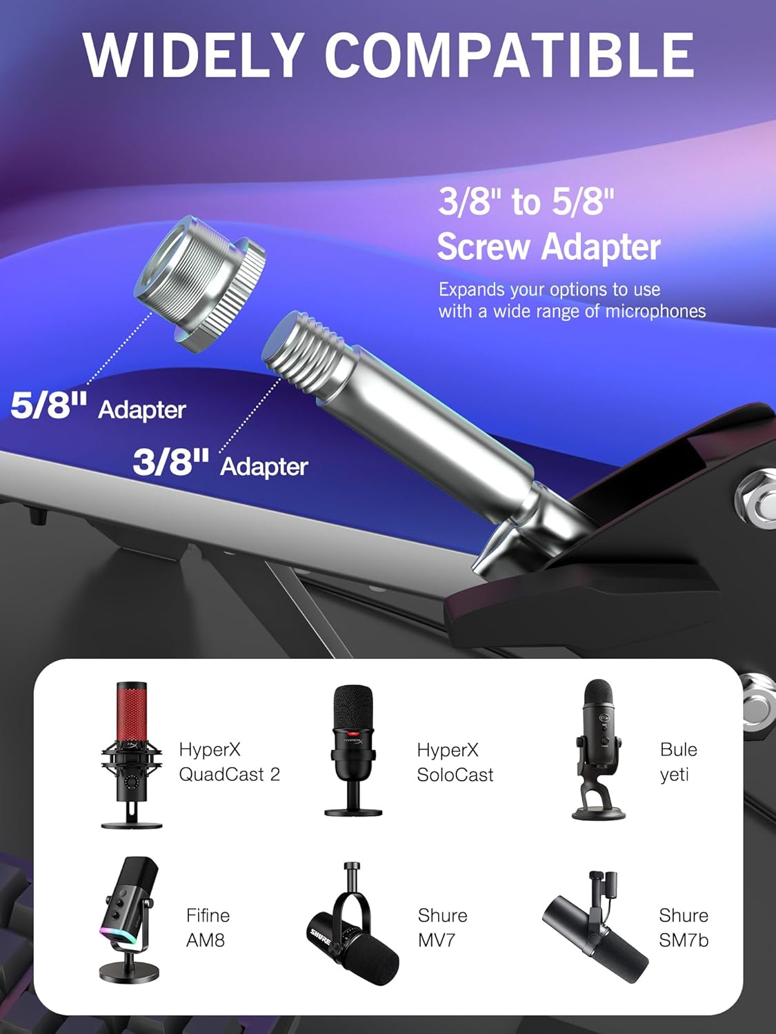 • Wide Adaptability - This microphone boom arm comes with 3/8" and 5/8" adaptors compatible with various models of microphones, For example: QuadCast, Blue Yeti, Snowball, solocast, Shure SM7B, Fifine AM8, Rode, Razer Mini and Most Gaming Mic
