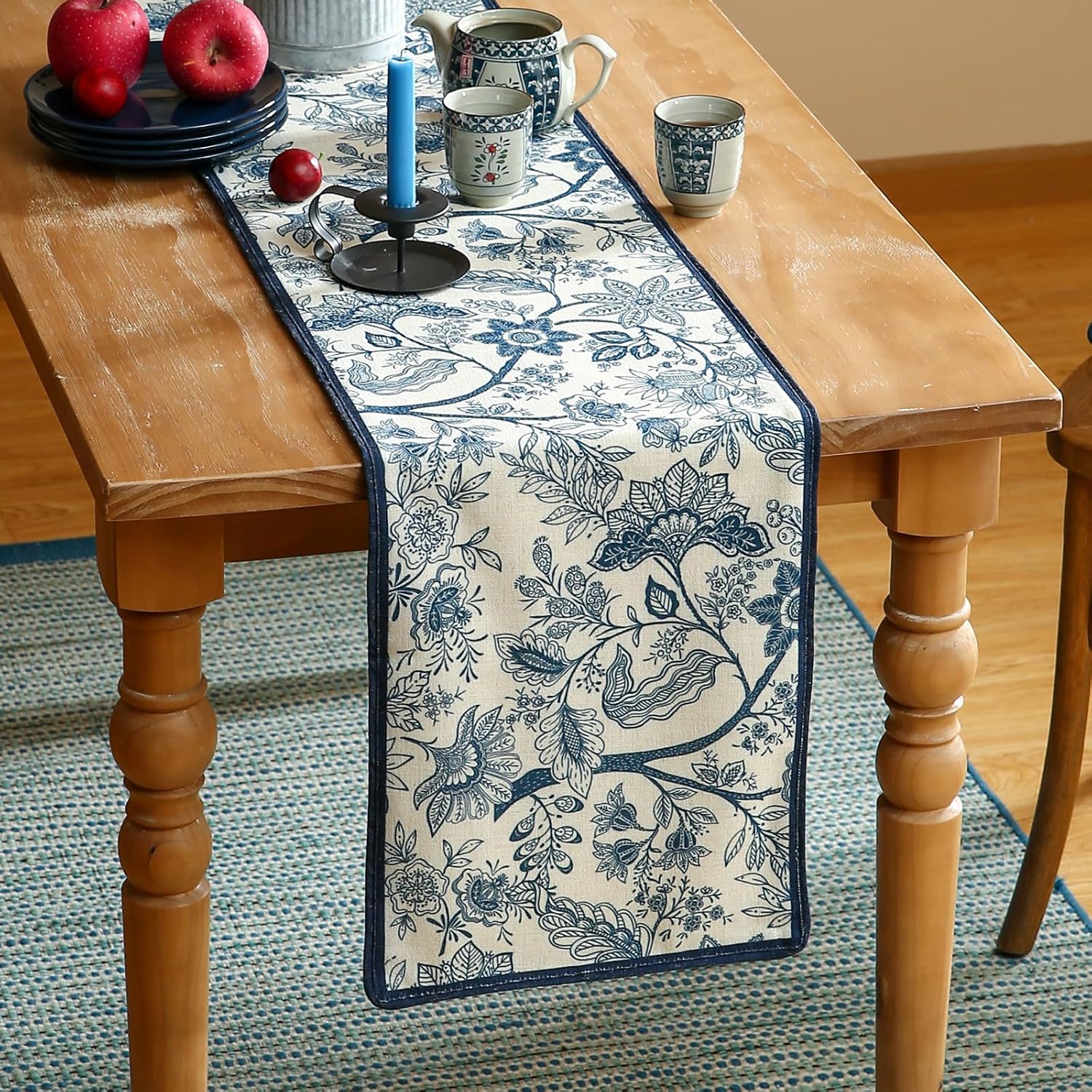 ISAENNE Designer Chinoiserie Elegant Linen Table Runner 102 Inches Long,Blue Floral Pattern Decor Table Runners for Thanksgiving,Dining Room,Banquet,Kitchen Tables,Christmas,12"*102"-Ruyi B