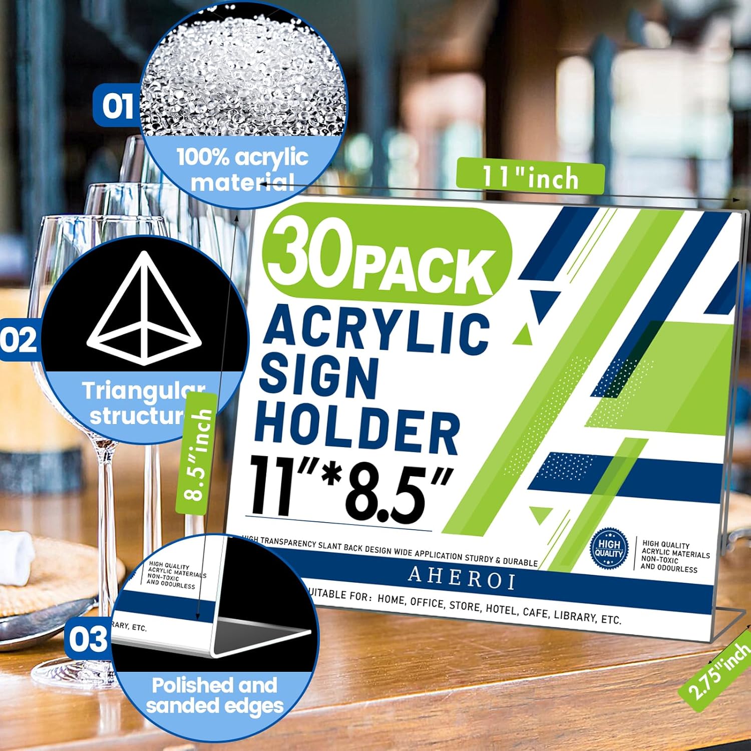 Aheroi 30Pcs Acrylic Sign Holder 8.5 x 11, L-shape Clear Sign Holders, Horizontal L-shape Acrylic Paper Holder, Plastic Table Sign Holders, Plastic Paper Holder Display Standing for Office Home School