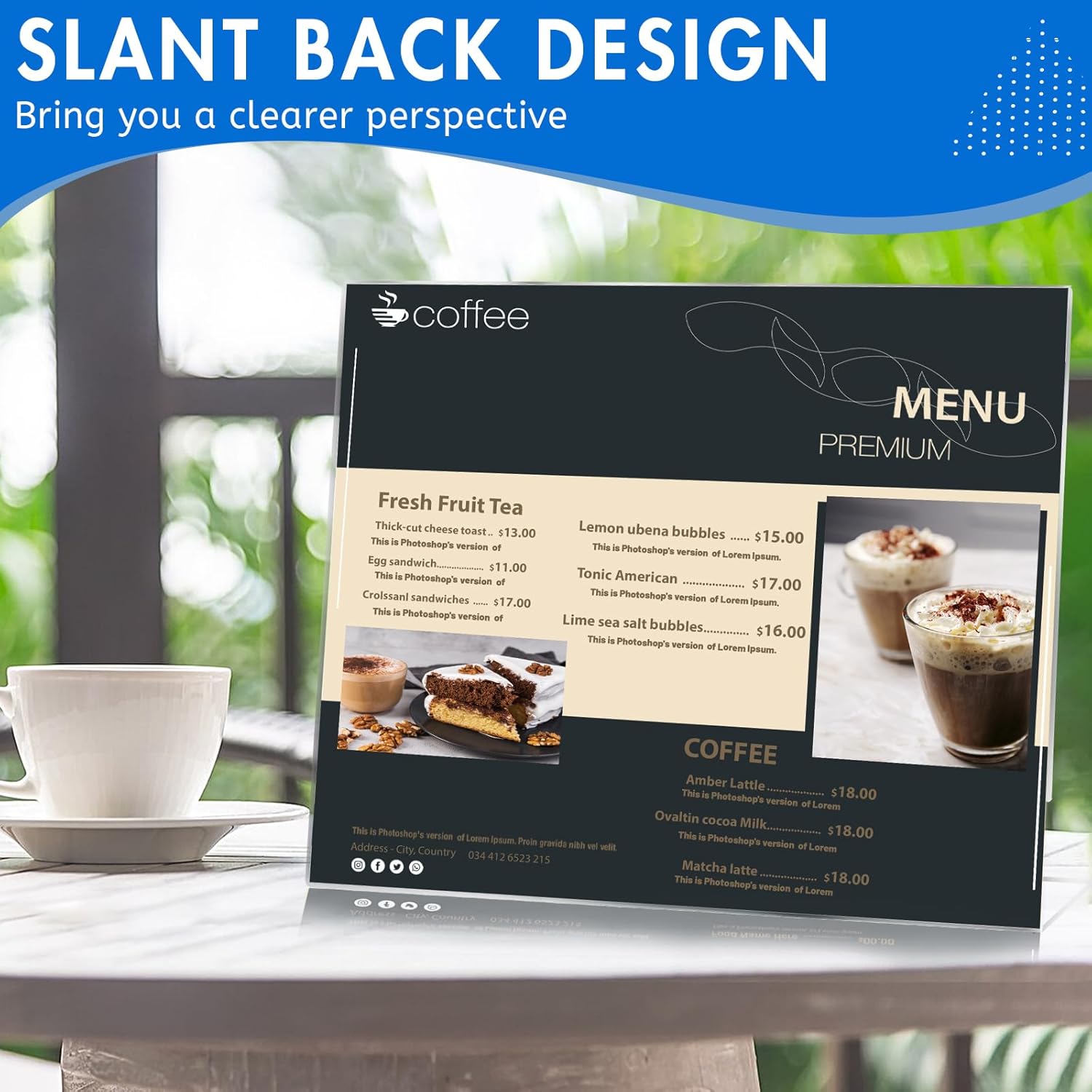 • Slant Back Design: The acrylic sign holders are designed with a slant back and tilts at a perfect angle to display the information on the paper, whether it's a guideline message or a dish. The bottom of the acrylic sign holder 8.5 x 11 is supported by an anti-tilt base for stability. Note: In order to ensure that you receive the most perfect table sign holders, we have attached a protective film on the surface of each acrylic stand, please remove the film before use